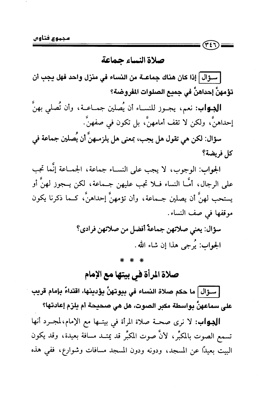 سؤال: إذا كان هناك جماعة من النساء في منزل واحد فهل يجب أن تؤمهن إحداهن في جميع الصلوات المفروضة؟