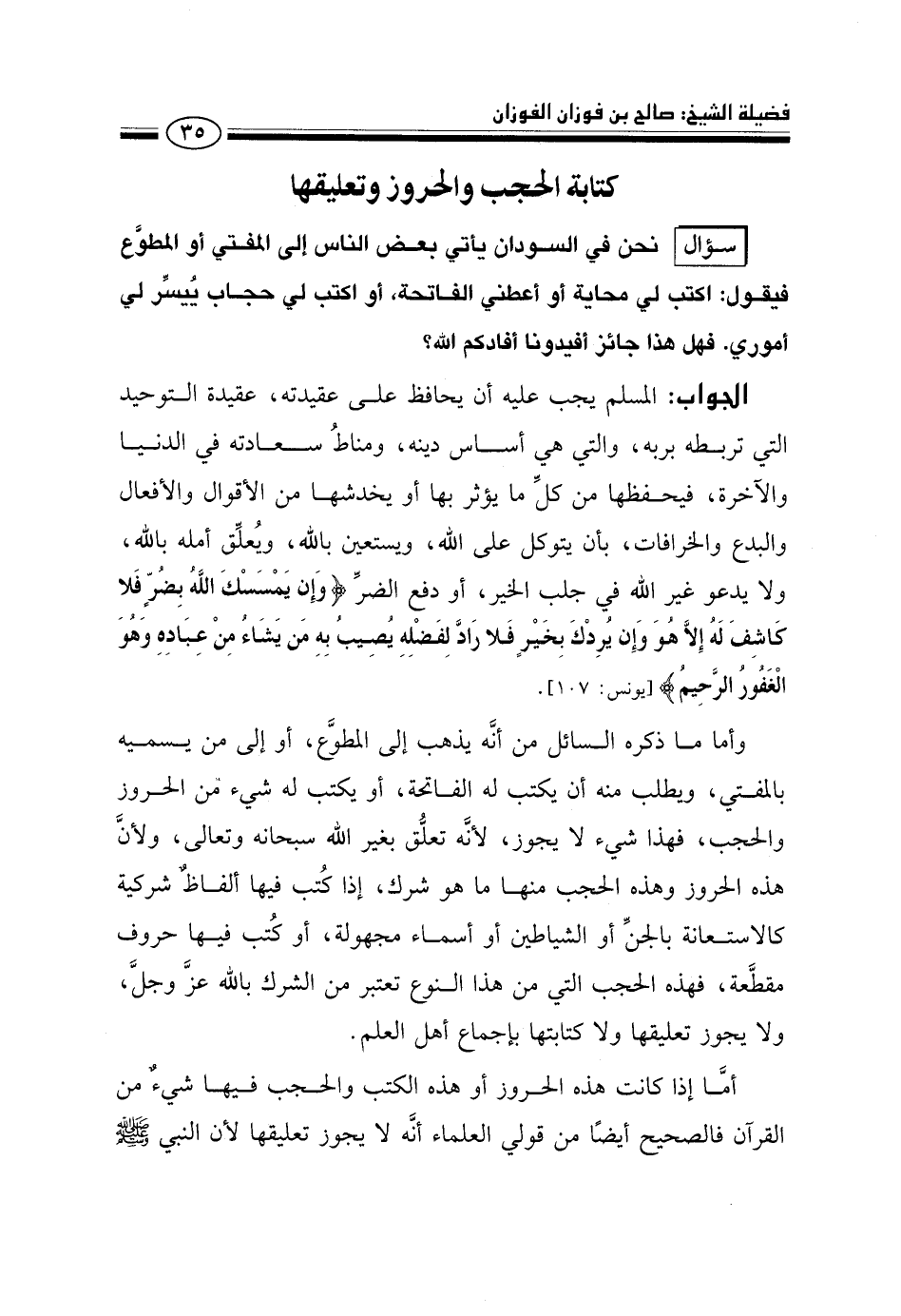 سؤال: نحن في السودان يأتي بعض الناس إلى المفتي أو المطوع، فيقول: اكتب لي محاية أو أعطني الفاتحة أو اكتب لي حجابا ييسر لي أموري، فهل هذا جائز، أفيدونا أفادكم الله؟