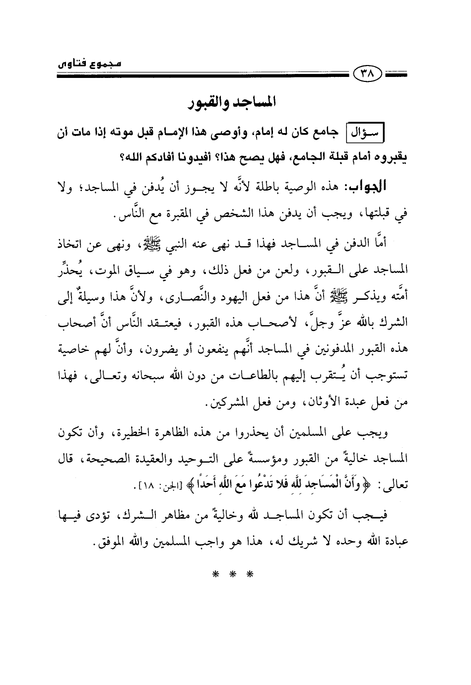 فيجب أن تكون المساجد لله وخالية من مظاهر الشرك، تؤدى فيها عبادة الله وحده لا شريك له، هذا هو واجب المسلمين، والله الموفق.