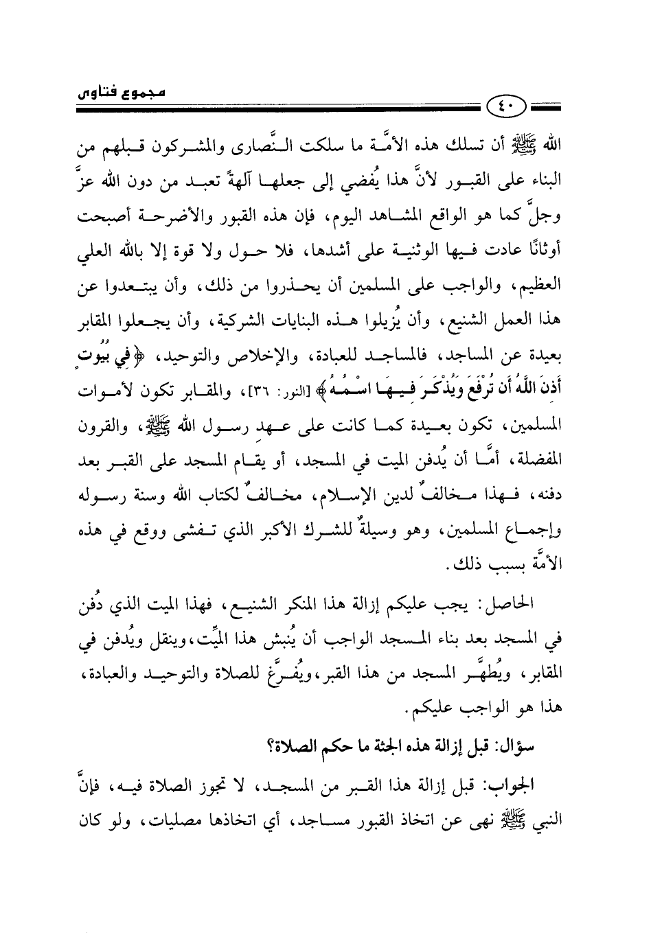 الله صلى الله عليه وسلم أن تسلك هذه الأمة ما سلكت النصارى والمشركون قبلهم من البناء على القبور؛ لأن هذا يفضي إلى جعلها آلهة تعبد من دون الله عز وجل كما هو الواقع المشاهد اليوم، فإن هذه القبور والأضرحة أصبحت أوثانًا عادت فيها الوثنية على أشدها، فلا حول ولا قوة إلا بالله العلي العظيم، والواجب على المسلمين أن يحذروا من ذلك، وأن يبتعدوا عن هذا العمل الشنيع، وأن يزيلوا هذه البنايات الشركية، وأن يجعلوا المقابر بعيدة عن المساجد، فالمساجد للعبادة والإخلاص والتوحيد، {فِي بُيُوتٍ أَذِنَ اللَّهُ أَنْ تُرْفَعَ وَيُذْكَرَ فِيهَا اسْمُهُ} [النور: 36] ، والمقابر تكون لأموات المسلمين، تكون بعيدة كما كانت على عهد رسول الله صلى الله عليه وسلم والقرون المفضلة، أما أن يدفن الميت في المسجد، أو يقام المسجد على القبر بعد دفنه، فهذا مخالف لدين الإسلام، مخالف لكتاب الله وسنة رسوله وإجماع المسلمين، وهو وسيلة للشرك الأكبر الذي تفشى ووقع في هذه الأمة بسبب ذلك.