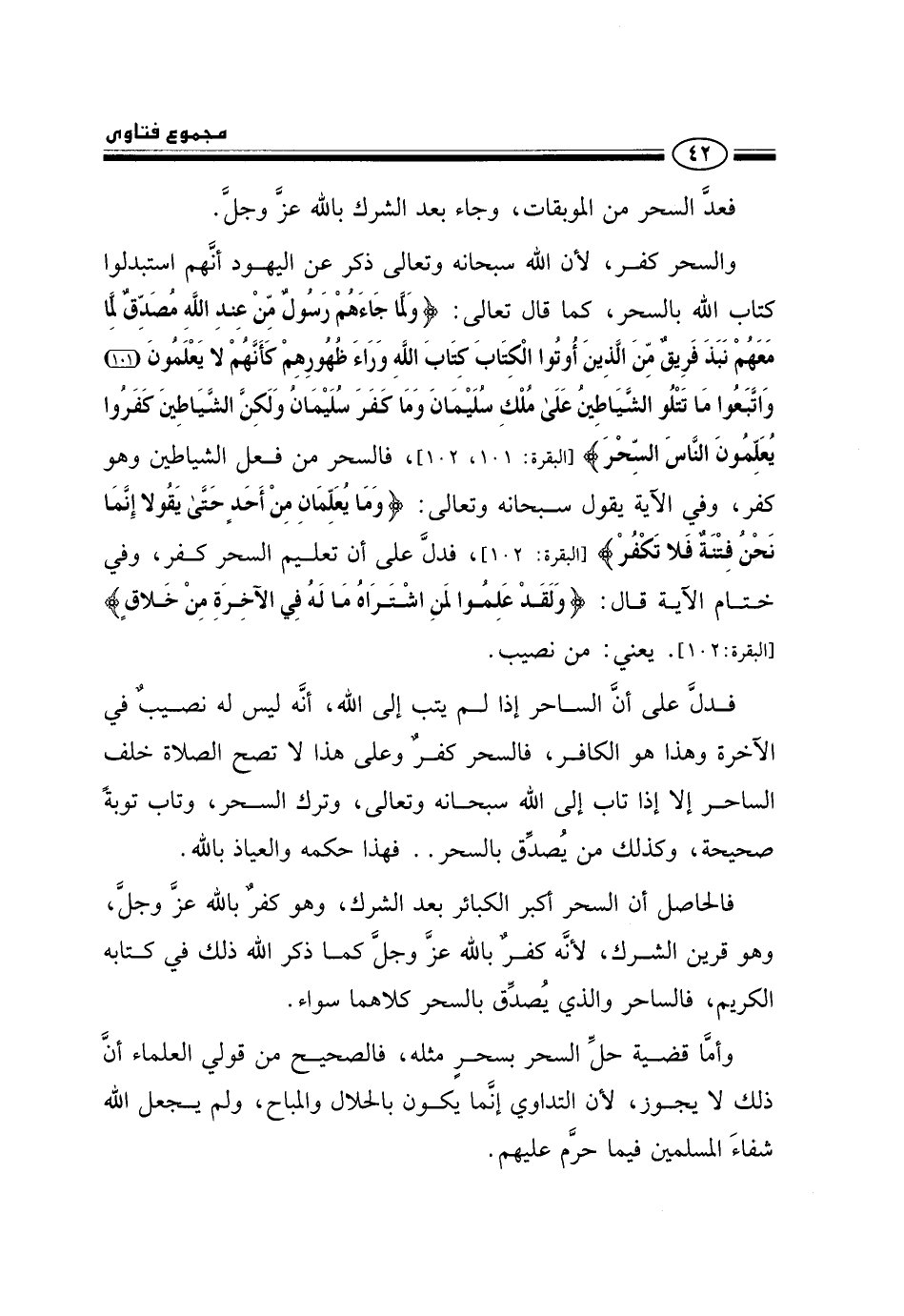 والسحر كفر؛ لأن الله سبحانه وتعالى ذكر عن اليهود أنهم استبدلوا كتاب الله بالسحر، كما قال تعالى: {وَلَمَّا جَاءَهُمْ رَسُولٌ مِنْ عِنْدِ اللَّهِ مُصَدِّقٌ لِمَا مَعَهُمْ نَبَذَ فَرِيقٌ مِنَ الَّذِينَ أُوتُوا الْكِتَابَ كِتَابَ اللَّهِ وَرَاءَ ظُهُورِهِمْ كَأَنَّهُمْ لَا يَعْلَمُونَ وَاتَّبَعُوا مَا تَتْلُو الشَّيَاطِينُ عَلَى مُلْكِ سُلَيْمَانَ وَمَا كَفَرَ سُلَيْمَانُ وَلَكِنَّ الشَّيَاطِينَ كَفَرُوا يُعَلِّمُونَ النَّاسَ السِّحْرَ} [البقرة: 101، 102] ، فالسحر من فعل الشياطين وهو كفر، وفي الآية يقول سبحانه وتعالى: {وَمَا يُعَلِّمَانِ مِنْ أَحَدٍ حَتَّى يَقُولَا إِنَّمَا نَحْنُ فِتْنَةٌ فَلَا تَكْفُرْ} [البقرة: 102] ، فدل على أن تعليم السحر كفر، وفي ختام الآية قال: {وَلَقَدْ عَلِمُوا لَمَنِ اشْتَرَاهُ مَا لَهُ فِي الْآخِرَةِ مِنْ خَلَاقٍ} [البقرة: 102] . يعني: من نصيب.