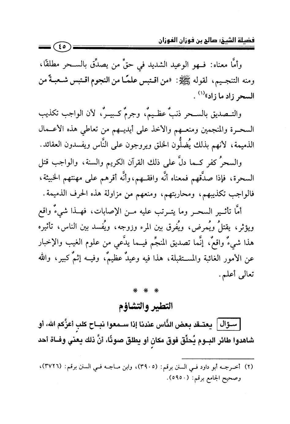 وأما معناه: فهو الوعيد الشديد في حق من يصدق بالسحر مطلقًا، ومنه التنجيم، لقوله صلى الله عليه وسلم: «من اقتبس علمًا من النجوم اقتبس شعبة من السحر زاد ما زاد» .
