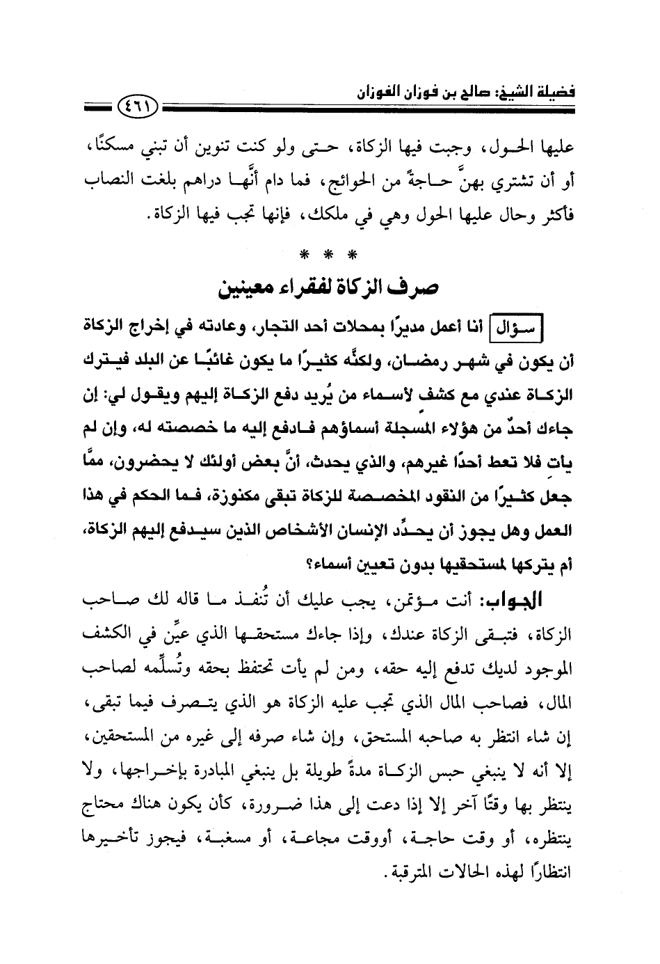 سؤال: أنا أعمل مديرًا بمحلات أحد التجار، وعادته في إخراج الزكاة أن يكون في شهر رمضان، ولكنه كثيرًا ما يكون غائبًا عن البلد فيترك الزكاة عندي مع كشف لأسماء من يريد دفع الزكاة إليهم ويقول لي: إن جاءك أحد من هؤلاء المسجلة أسماؤهم فادفع إليه ما خصصته له، وإن لم يأت فلا تعط أحدًا غيرهم، والذي يحدث أن بعض أولئك لا يحضرون، مما جعل كثيرًا من النقود المخصصة للزكاة تبقى مكنوزة، فما الحكم في هذا العمل وهل يجوز أن يحدد الإنسان الأشخاص الذين سيدفع إليهم الزكاة، أم يتركها لمستحقيها بدون تعيين أسماء؟