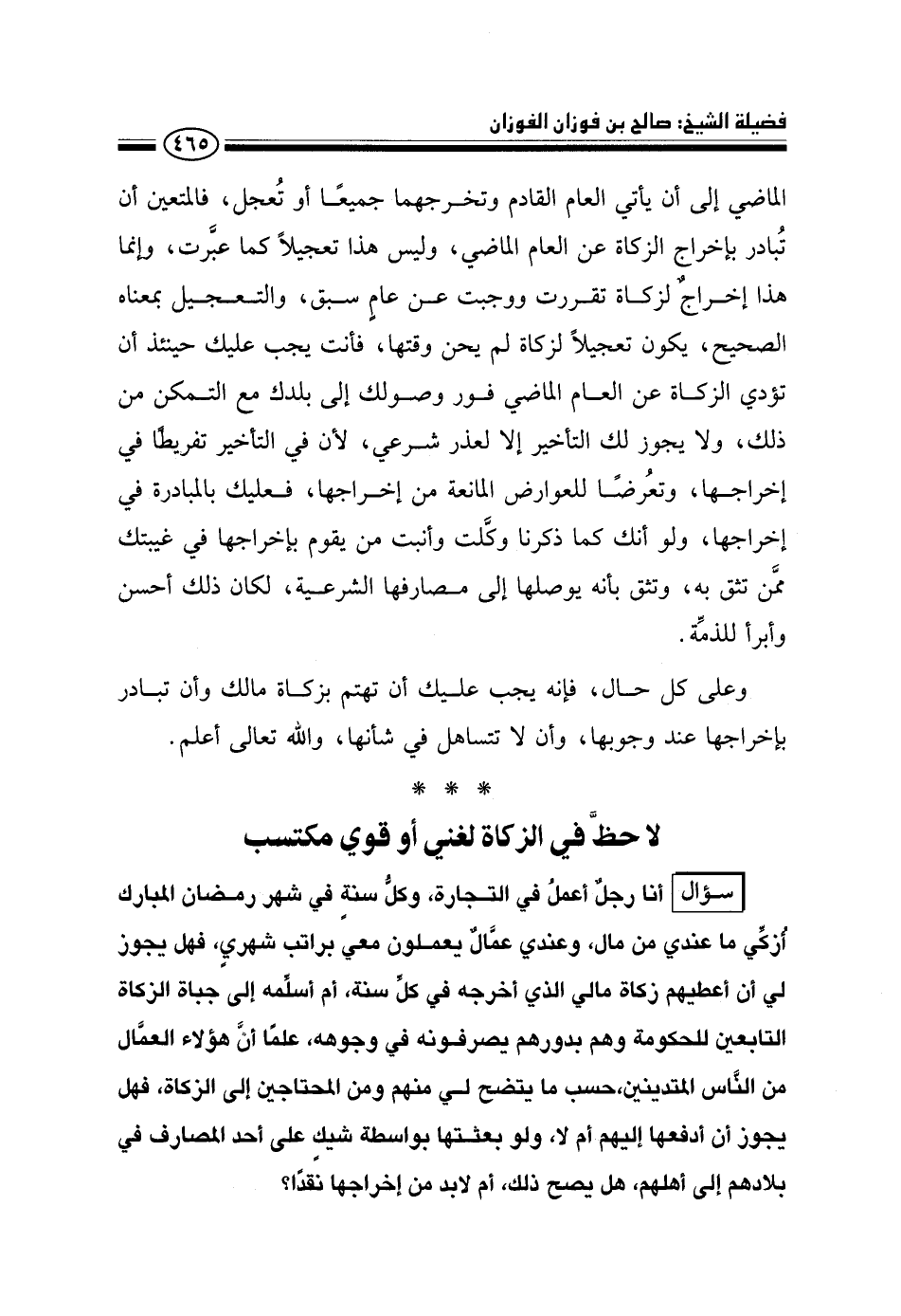 الماضي إلى أن يأتي العام القادم وتخرجهما جميعًا أو تعجل، فالمتعين أن تبادر بإخراج الزكاة عن الماضي، وليس هذا تعجيلًا كما عبرت، وإنما هذا إخراج لزكاة تقررت ووجبت عن عام سبق، والتعجيل بمعناه الصحيح، يكون تعجيلًا لزكاة لم يحن وقتها، فأنت يجب عليك حينئذ أن تؤدي الزكاة عن العام الماضي فور وصولك إلى بلدك مع التمكن من ذلك، ولا يجوز لك التأخير إلا لعذر شرعي، لأن في التأخير تفريطًا في إخراجها، وتعرضًا للعوارض المانعة من إخراجها، فعليك بالمبادرة في إخراجها، ولو أنك كما ذكرنا وكلت وأنبت من يقوم بإخراجها في غيبتك ممن تثق به، وتثق بأنه يوصلها إلى مصارفها الشرعية، لكان ذلك أحسن وأبرأ للذمة.