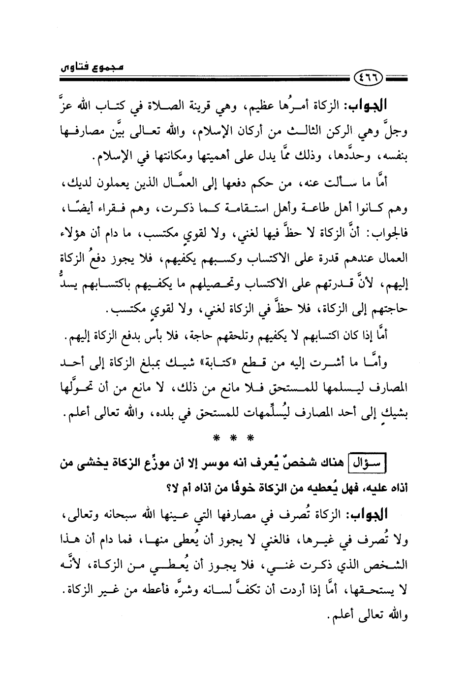 أما ما سألت عنه، من حكم دفعها إلى العمال الذين يعملون لديك، وهم كانوا أهل طاعة وأهل استقامة كما ذكرت، وهم فقراء أيضًا، فالجواب: أن الزكاة لا حظ فيها لغني، ولا لقوي مكتسب، ما دام أن هؤلاء العمال عندهم قدرة على الاكتساب وكسبهم يكفيهم، فلا يجوز دفع الزكاة إليهم، لأن قدرتهم على الاكتساب وتحصيلهم ما يكفيهم باكتسابهم يسد حاجتهم إلى الزكاة، فلا حظ في الزكاة لغني، ولا لقوي مكتسب.