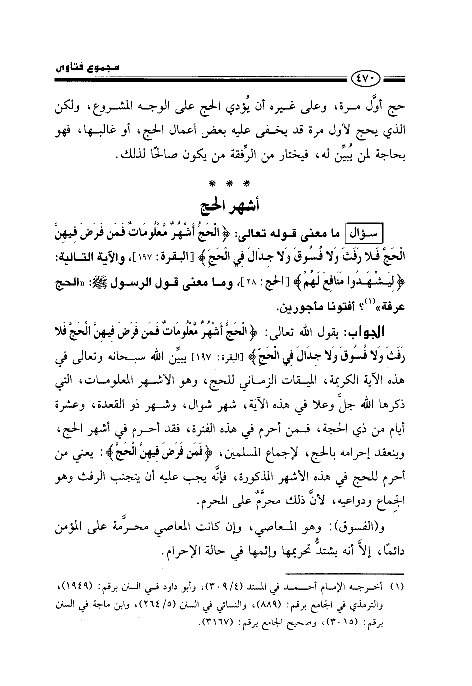 سؤال: ما معنى قوله: {الْحَجُّ أَشْهُرٌ مَعْلُومَاتٌ فَمَنْ فَرَضَ فِيهِنَّ الْحَجَّ فَلَا رَفَثَ وَلَا فُسُوقَ وَلَا جِدَالَ فِي الْحَجِّ} [البقرة: 197] ، والآية التالية: {لِيَشْهَدُوا مَنَافِعَ لَهُمْ} [الحج: 28] ، وما معنى قول الرسول صلى الله عليه وسلم: «الحج عرفة؟» أفتونا مأجورين.