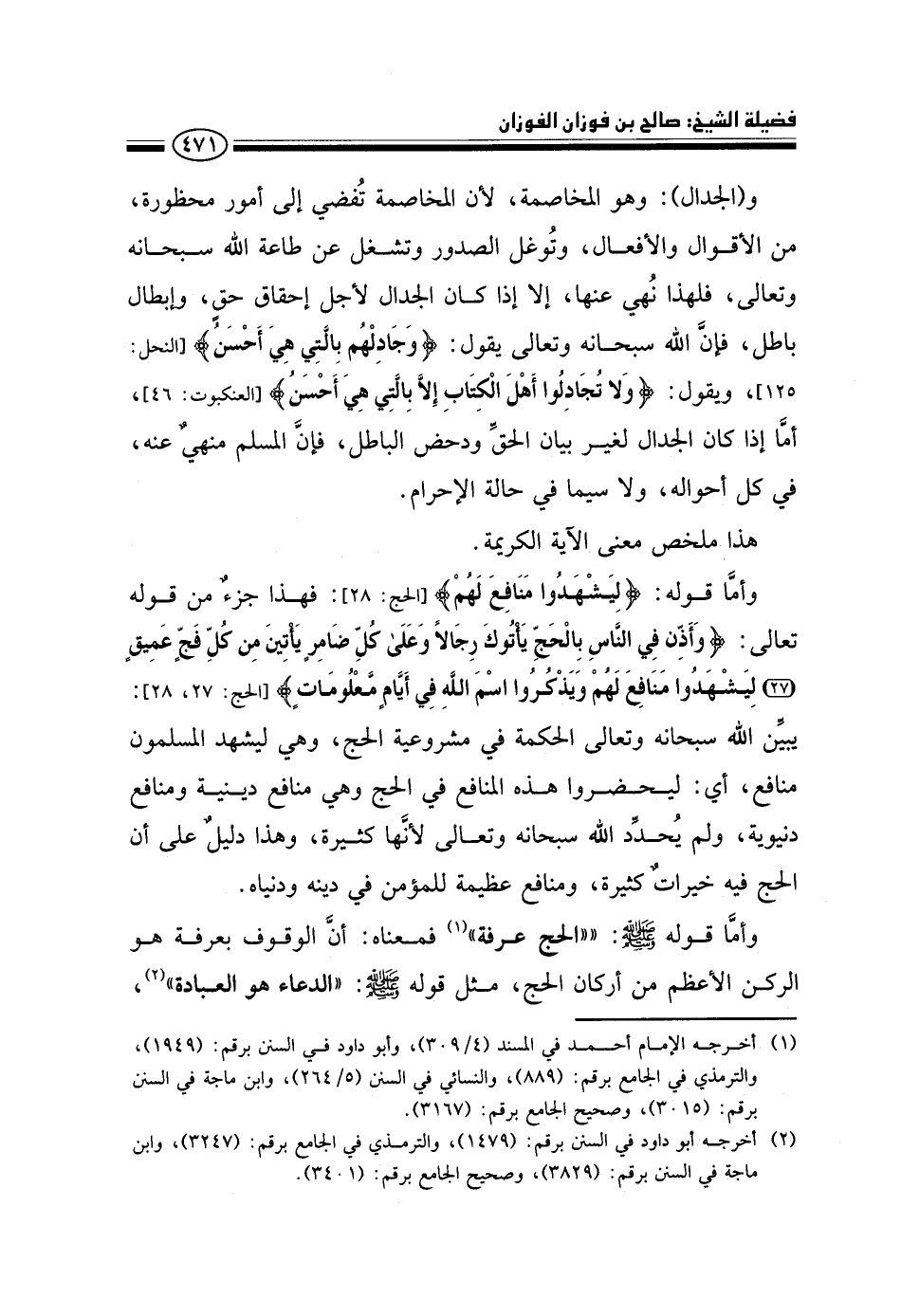 و (الجدال) : وهو المخاصمة، لأن المخاصمة تفضي إلى أمور محظورة، من الأقوال والأفعال، وتوغل الصدور وتشغل عن طاعة الله سبحانه وتعالى، فلهذا نهي عنها، إلا إذا كان الجدال لأجل إحقاق حق، وإبطال باطل، فإن الله سبحانه وتعالى يقول: {وَجَادِلْهُمْ بِالَّتِي هِيَ أَحْسَنُ} [النحل: 125] ، ويقول: {وَلَا تُجَادِلُوا أَهْلَ الْكِتَابِ إِلَّا بِالَّتِي هِيَ أَحْسَنُ} [العنكبوت: 46] ، أما إذا كان الجدال لغير بيان الحق ودحض الباطل، فإن المسلم منهي عنه، في كل أحواله، ولا سيما في حالة الإحرام.
