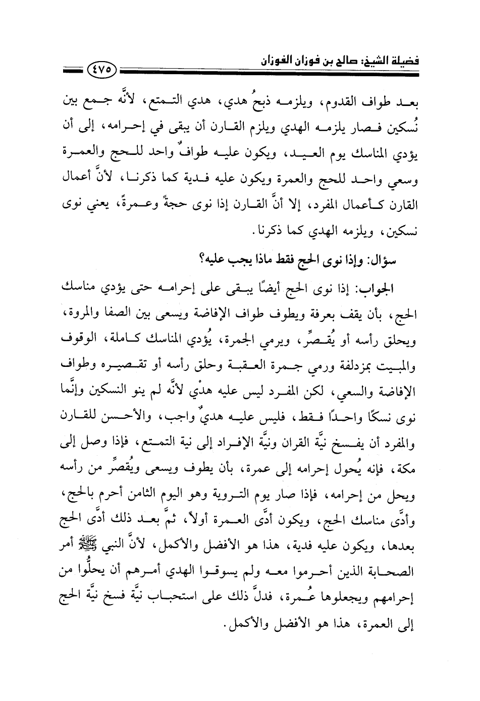 بعد طواف القدوم، ويلزمه ذبح هدي، هدي التمتع، لأنه جمع بين نسكين فصار يلزمه الهدي ويلزم القارن أن يبقى في إحرامه، إلى أن يؤدي المناسك يوم العيد، ويكون عليه طواف واحد للحج والعمرة وسعي واحد للحج والعمرة ويكون عليه فدية كما ذكرنا، لأن أعمال القارن كأعمال المفرد، إلا أن القارن إذا نوى حجة وعمرة -يعني نوى نسكين- يلزمه الهدي كما ذكرنا.