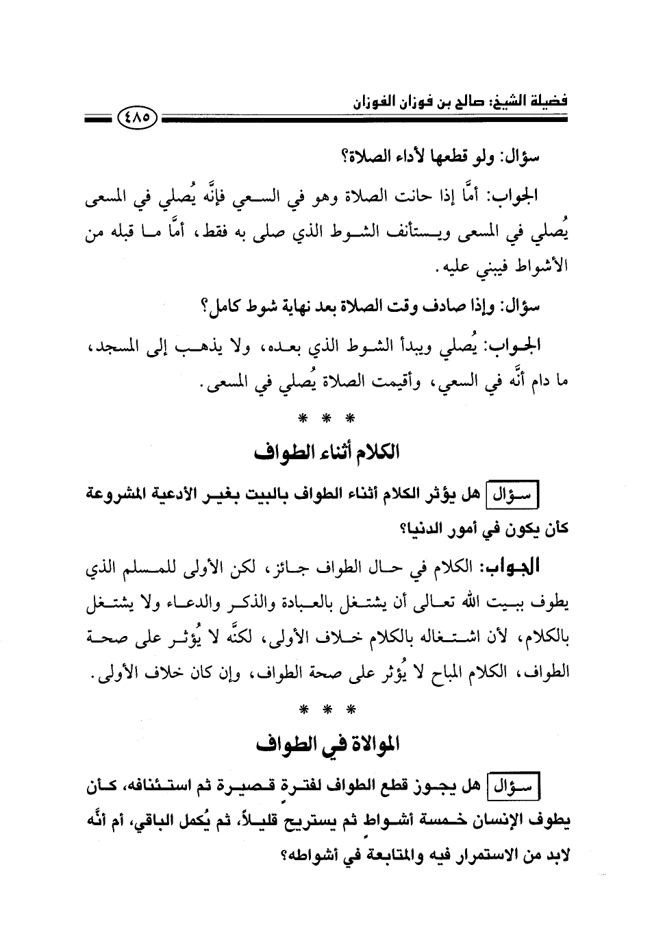 سؤال: هل يجوز قطع الطواف لفترة قصيرة ثم استئنافه، كأن يطوف الإنسان خمسة أشواط ثم يستريح قليلًا، ثم يكمل الباقي، أم أنه لا بد من الاستمرار فيه والمتابعة في أشواطه؟