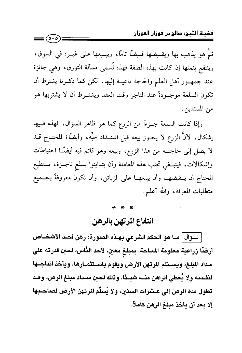 ثم هو يذهب بها ويقبضها قبضًا تامًّا، ويبيعها على غيره في السوق، وينتفع بثمنها إذا كانت بهذه الصفة فهذه تسمى مسألة التورق، وهي جائزة عند جمهور أهل العلم والحاجة داعية إليها، لكن كما ذكرنا يشترط أن تكون السلعة موجودة عند التاجر وقت العقد ويشترط أن لا يشتريها هو من المستدين.