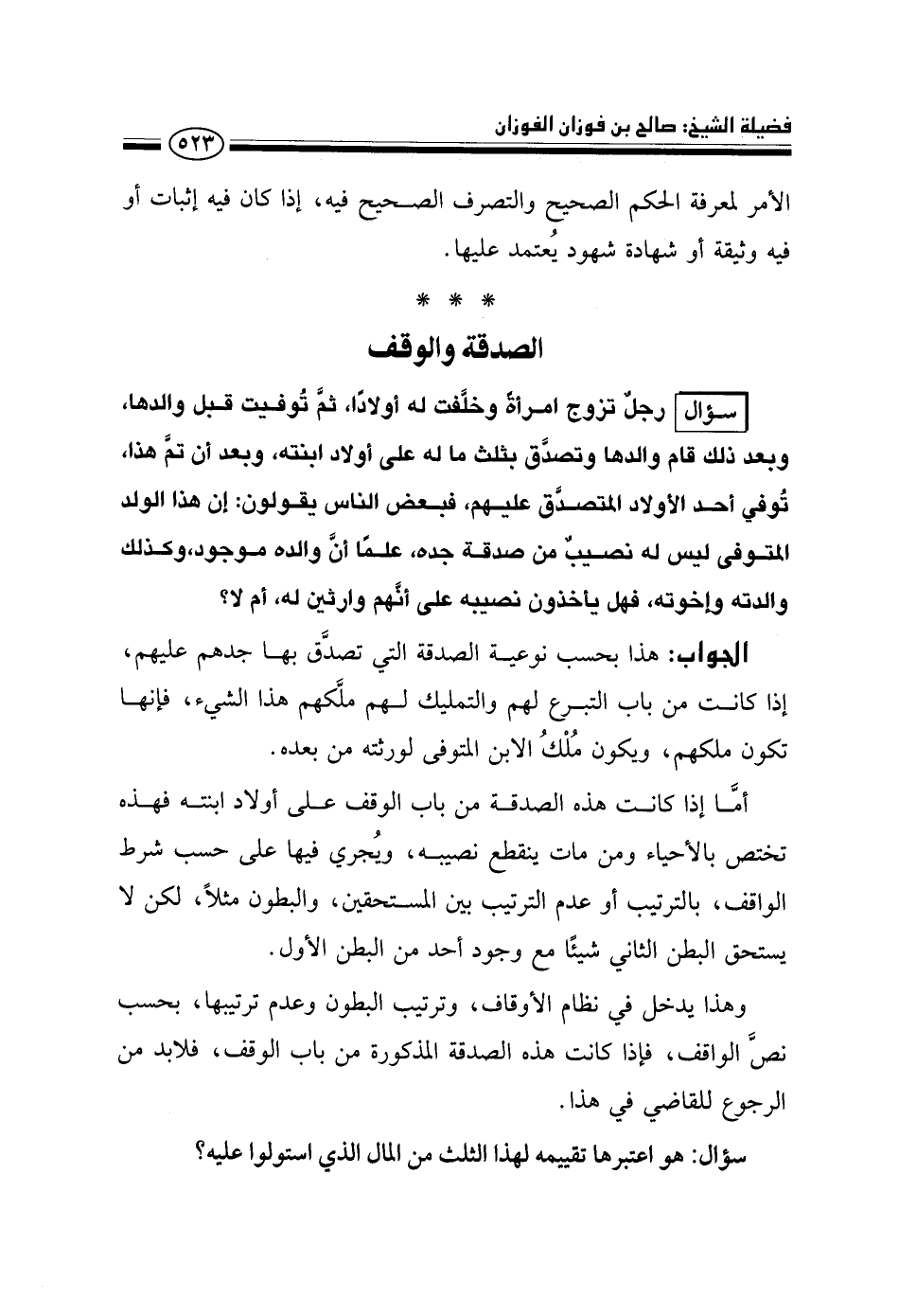 وهذا يدخل في نظام الأوقاف، وترتيب البطون وعدم ترتيبها، بحسب نص الواقف، فإذا كانت هذه الصدقة المذكورة من باب الوقف، فلا بد من الرجوع للقاضي في هذا.