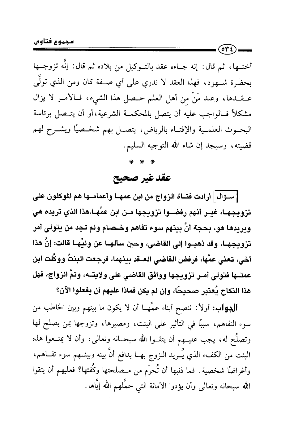 أختها، ثم قال: إنه جاءه عقد بالتوكيل من بلاده ثم قال: إنه تزوجها بحضرة شهود، فهذا العقد لا ندري على أي صفة كان ومن الذي تولى عقدها، وعند مَن مِن أهل العلم حصل هذا الشيء، فالأمر لا يزال مشكلًا فالواجب عليه أن يتصل بالمحكمة الشرعية، أو أن يتصل برئاسة البحوث العلمية والإفتاء بالرياض، يتصل بهم شخصيًّا ويشرح لهم قضيته، وسيجد إن شاء الله التوجيه السليم.