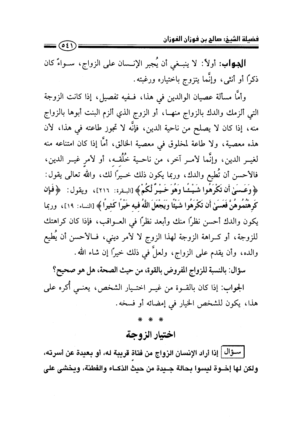 وأما مسألة عصيان الوالدين في هذا، ففيه تفصيل، إذا كانت الزوجة التي ألزمك والدك بالزواج منها، أو الزوج الذي ألزم البنت أبوها بالزواج منه، إذا كان لا يصلح من ناحية الدين، فإنه لا تجوز طاعته في هذا، لأن هذه معصية، «ولا طاعة لمخلوق في معصية الخالق،» أما إذا كان امتناعه منه لغير الدين، وإنما لأمر آخر، من ناحية خلقه، أو لأمر غير الدين، فالأحسن أن تطيع والدك، وربما يكون ذلك خيرًا لك، والله تعالى يقول: {وَعَسَى أَنْ تَكْرَهُوا شَيْئًا وَهُوَ خَيْرٌ لَكُمْ} [البقرة: 216] ، ويقول: {فَإِنْ كَرِهْتُمُوهُنَّ فَعَسَى أَنْ تَكْرَهُوا شَيْئًا وَيَجْعَلَ اللَّهُ فِيهِ خَيْرًا كَثِيرًا} [النساء: 19] ، وربما يكون والدك أحسن نظرًا منك وأبعد نظرًا في العواقب، فإذا كان كراهتك للزوجة، أو كراهة الزوجة لهذا الزوج لا لأمر ديني، فالأحسن أن يطيع والده، وأن يقدم على الزواج، ولعل في ذلك خيرًا إن شاء الله.