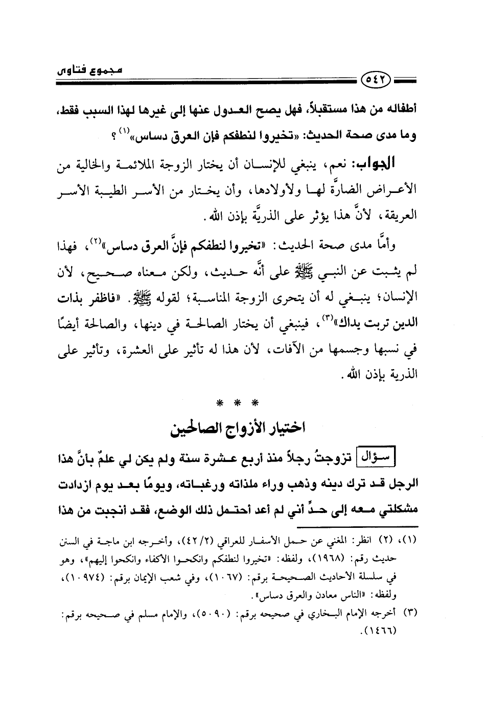 وأما مدى صحة الحديث: «تخيروا لنطفكم فإن العرق دساس» ، فهذا لم يثبت عن النبي صلى الله عليه وسلم على أنه حديث، ولكن معناه صحيح، لأن الإنسان؛ ينبغي له أن يتحرى الزوجة المناسبة؛ لقوله صلى الله عليه وسلم: «فاظفر بذات الدين تربت يداك» ، فينبغي أن يختار الصالحة في دينها، والصالحة أيضًا في نسبها وجسمها من الآفات، لأن هذا له تأثير على العشرة، وتأثير على الذرية بإذن الله.