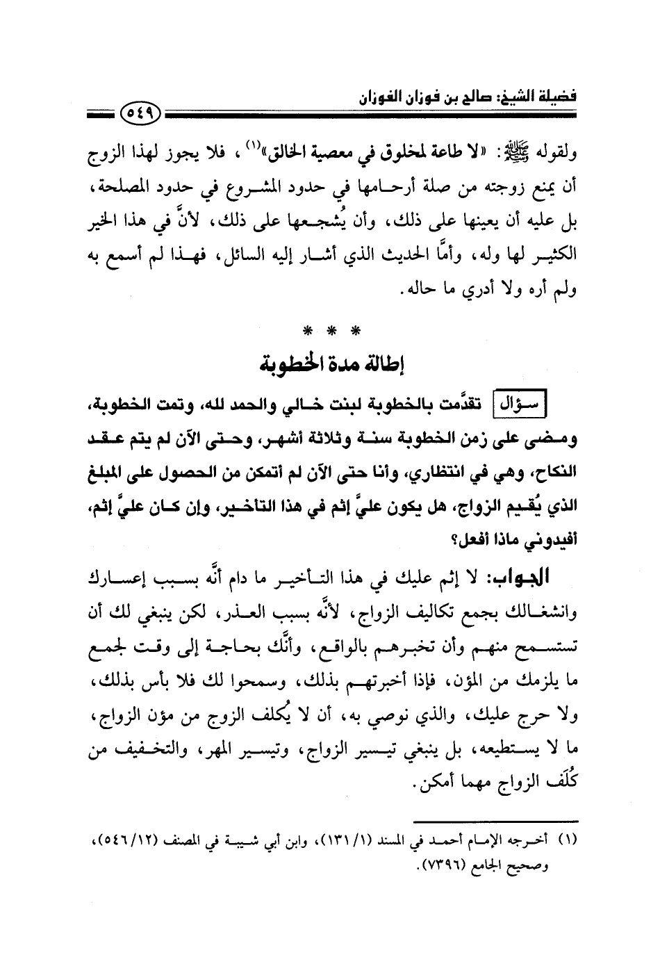 سؤال: تقدمت بالخطوبة لبنت خالي والحمد لله، وتمت الخطوبة، ومضى على زمن الخطوبة سنة وثلاثة أشهر، وحتى الآن لم يتم عقد النكاح، وهي في انتظاري، وأنا حتى الآن لم أتمكن من الحصول على المبلغ الذي يقيم الزواج، هل يكون علي إثم في هذا التأخير، وإن كان علي إثم، أفيدوني ماذا أفعل؟