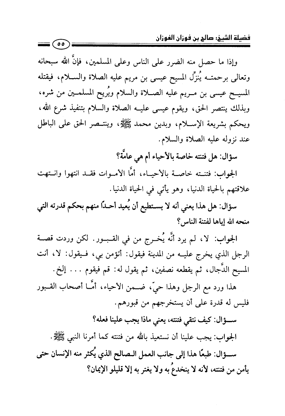 سؤال: طبعًا هذا إلى جانب العمل الصالح الذي يكثر منه الإنسان حتى يأمن من فتنته؛ لأنه لا ينخدع به ولا يغتر به إلا قليلو الإيمان؟