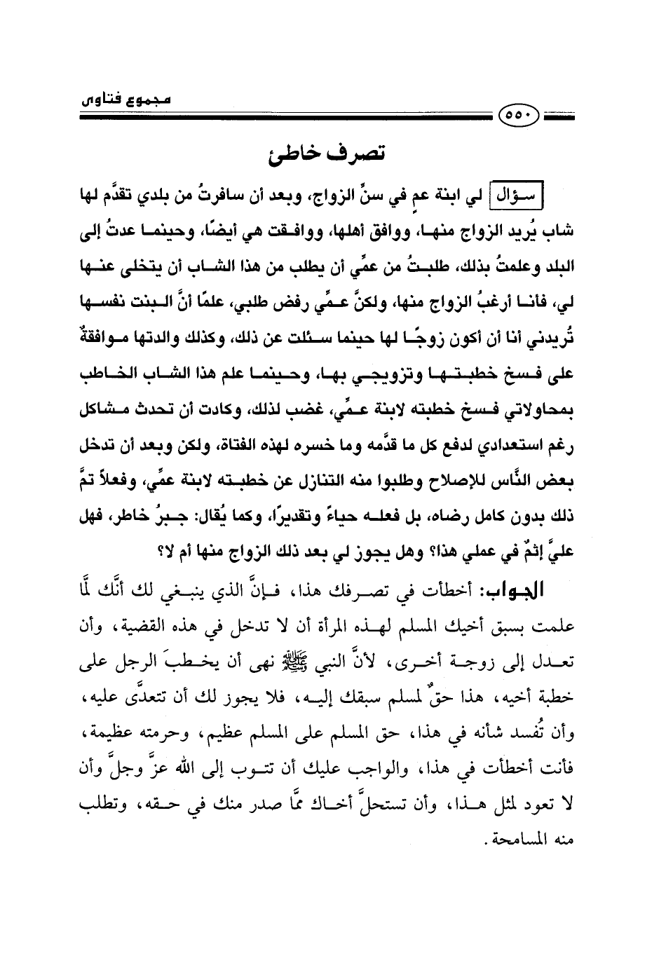 سؤال: لي ابنة عم في سن الزواج، وبعد أن سافرت من بلدي تقدم لها شاب يريد الزواج منها، ووافق أهلها، ووافقت هي أيضًا، وحينما عدت إلى البلد وعلمت بذلك، طلبت من عمي أن يطلب من هذا الشاب أن يتخلى عنها لي، فأنا أرغب الزواج منها، ولكن عمي رفض طلبي، علمًا أن البنت نفسها تريدني أنا أن أكون زوجًا لها حينما سئلت عن ذلك، وكذلك والدتها موافقة على فسخ خطبتها وتزويجي بها، وحينما علم هذا الشاب الخاطب بمحاولاتي فسخ خطبته لابنة عمي، غضب لذلك، وكادت أن تحدث مشاكل رغم استعدادي لدفع كل ما قدمه وما خسره لهذه الفتاة، ولكن وبعد أن تدخل بعض الناس للإصلاح وطلبوا منه التنازل عن خطبته لابنة عمي، وفعلًا تم ذلك بدون كامل رضاه، بل فعله حياءً وتقديرًا، وكما يقال: جبر خاطر، فهل علي إثم في عملي هذا؟ وهل يجوز لي بعد ذلك الزواج منها أم لا؟