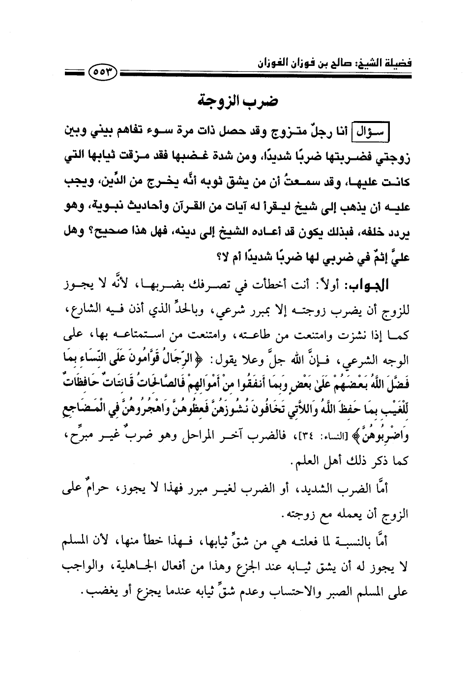سؤال: أنا رجل متزوج وقد حصل ذات مرة سوء تفاهم بيني وبين زوجتي فضربتها ضربًا شديدًا، ومن شدة غضبها فقد مزقت ثيابها التي كانت عليها، وقد سمعت أن من يشق ثوبه أنه يخرج من الدين، ويجب عليه أن يذهب إلى شيخ ليقرأ له آيات من القرآن وأحاديث نبوية، وهو يردد خلفه، فبذلك يكون قد أعاده الشيخ إلى دينه، فهل هذا صحيح؟ وهل علي إثم في ضربي لها ضربًا شديدًا أم لا؟