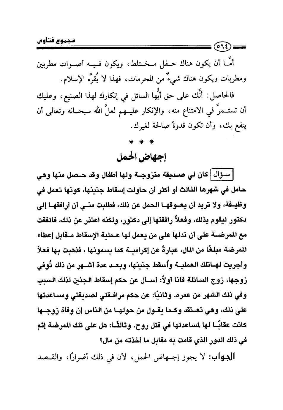 سؤال: كان لي صديقة متزوجة ولها أطفال وقد حصل منها وهي حامل في شهرها الثالث أو أكثر أن حاولت إسقاط جنينها، كونها تعمل في وظيفة، ولا تريد أن يعوقها الحمل عن ذلك، فطلبت مني أن أرافقها إلى دكتور ليقوم بذلك، وفعلًا رافقتها إلى دكتور، ولكنه اعتذر عن ذلك، فاتفقت مع الممرضة على أن تدلها على من يعمل لها عملية الإسقاط مقابل إعطاء الممرضة مبلغًا من المال، عبارة عن إكرامية كما يسمونها، فذهبت بها فعلًا وأجريت لها تلك العملية وأسقط جنينها، وبعد عدة أشهر من ذلك توفي زوجها، زوج السائلة، فأنا أولًا: أسأل عن حكم إسقاط الجنين لذلك السبب وفي ذلك الشهر من عمره. وثانيًا: عن حكم مرافقتي لصديقتي ومساعدتها على ذلك، وهي تعتقد وكما يقول من حولها من الناس إن وفاة زوجها كانت عقابًا لها لمساعدتها في قتل روح. وثالثًا: هل على تلك الممرضة إثم في ذلك الدور الذي قامت به مقابل ما أخذته من مال؟