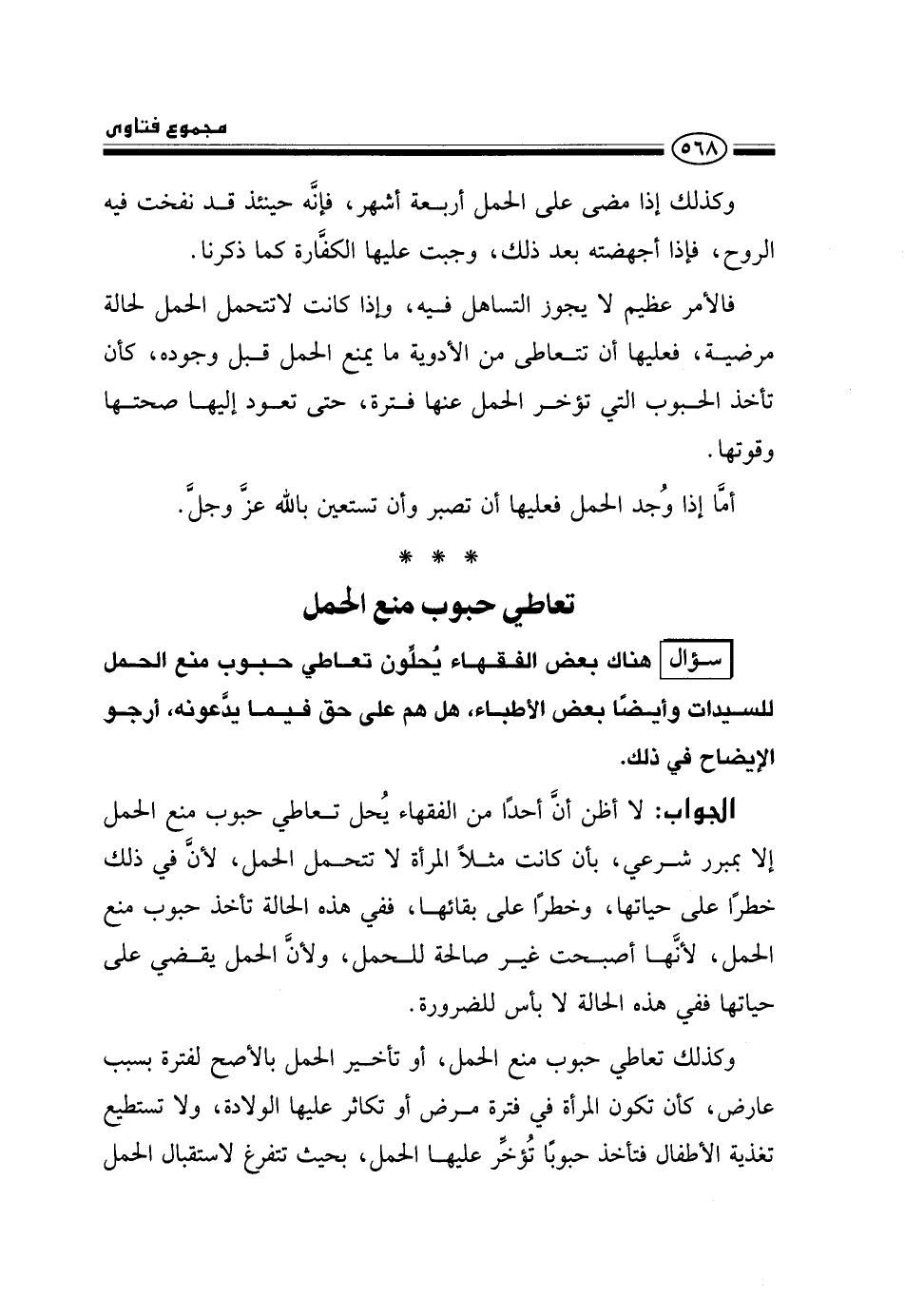 الجواب: لا أظن أن أحدًا من الفقهاء يحل تعاطي حبوب منع الحمل إلا بمبرر شرعي، بأن كانت مثلًا المرأة لا تتحمل الحمل، لأن في ذلك خطرًا على حياتها، وخطرًا على بقائها، ففي هذه الحالة تأخذ حبوب منع الحمل، لأنها أصبحت غير صالحة للحمل، ولأن الحمل يقضي على حياتها ففي هذه الحالة لا بأس للضرورة.