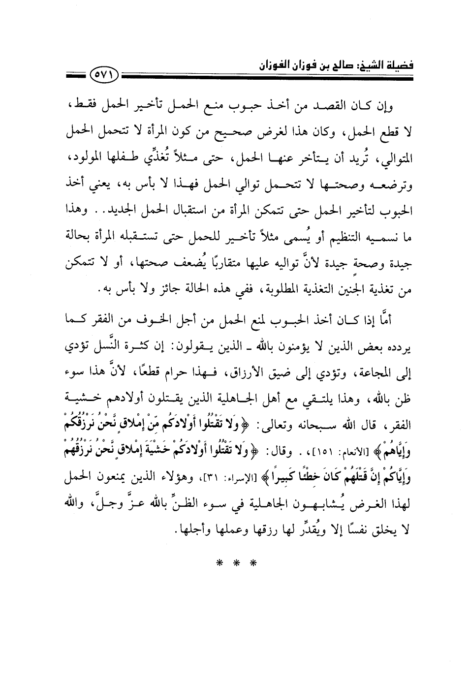 أما إذا كان أخذ الحبوب لمنع الحمل من أجل الخوف من الفقر كما يردده بعض الذين لا يؤمنون بالله، الذين يقولون: إن كثرة النسل تؤدي إلى المجاعة، وتؤدي إلى ضيق الأرزاق، فهذا حرام قطعًا، لأن هذا سوء ظن بالله، وهذا يلتقي مع أهل الجاهلية الذين يقتلون أولادهم خشية الفقر، قال الله سبحانه وتعالى: {وَلَا تَقْتُلُوا أَوْلَادَكُمْ مِنْ إِمْلَاقٍ نَحْنُ نَرْزُقُكُمْ وَإِيَّاهُمْ} [الأنعام: 151] ، وقال: {وَلَا تَقْتُلُوا أَوْلَادَكُمْ خَشْيَةَ إِمْلَاقٍ نَحْنُ نَرْزُقُهُمْ وَإِيَّاكُمْ إِنَّ قَتْلَهُمْ كَانَ خِطْئًا كَبِيرًا} [الإسراء: 31] ، وهؤلاء الذين يمنعون الحمل لهذا الغرض يشابهون الجاهلية في سوء الظن بالله عز وجل، والله لا يخلق نفسًا إلا ويقدر لها رزقها وعملها وأجلها.