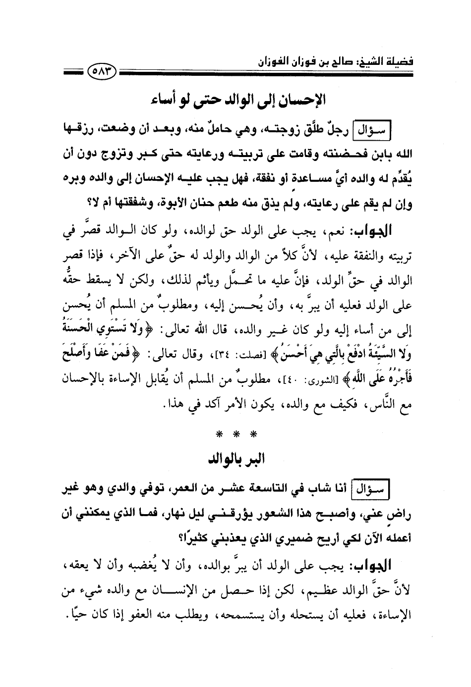 سؤال: رجل طلق زوجته، وهي حامل منه، وبعد أن وضعت، رزقها الله بابن فحضنته وقامت على تربيته ورعايته حتى كبر وتزوج دون أن يقدم له والده أي مساعدة أو نفقة، فهل يجب عليه الإحسان إلى والده وبره وإن لم يقم على رعايته، ولم يذق منه طعم حنان الأبوة، وشفقتها أم لا؟