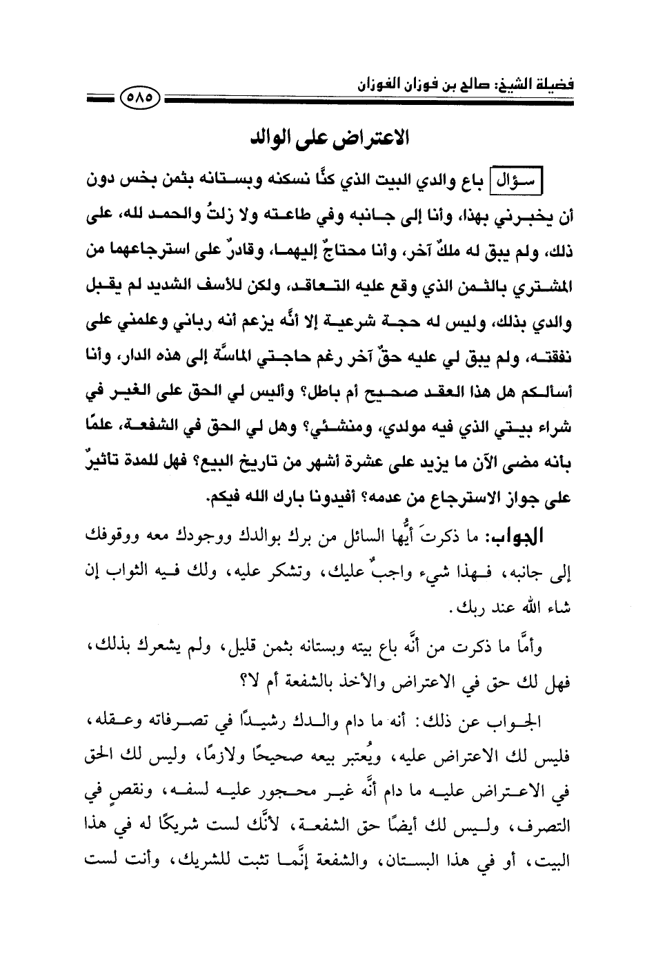 الجواب عن ذلك: أنه ما دام والدك رشيدًا في تصرفاته وعقله، فليس لك الاعتراض عليه، ويعتبر بيعه صحيحًا ولازمًا، وليس لك الحق في الاعتراض عليه ما دام أنه غير محجور عليه لسفه، ونقص في التصرف، وليس لك أيضًا حق الشفعة، لأنك لست شريكًا له في هذا البيت، أو في هذا البستان، والشفعة إنما تثبت للشريك، وأنت لست