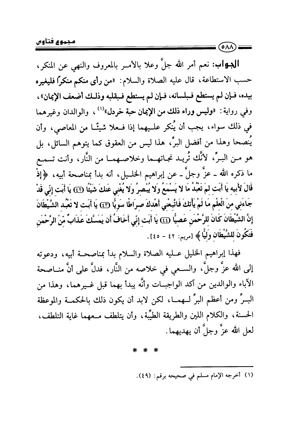 الجواب: نعم أمر الله جل وعلا بالأمر بالمعروف والنهي عن المنكر، حسب الاستطاعة، قال عليه الصلاة والسلام: «من رأى منكم منكرًا فليغيره بيده، فإن لم يستطع فبلسانه، فإن لم يستطع فبقلبه وذلك أضعف الإيمان» ، وفي رواية: «وليس وراء ذلك من الإيمان حبة خردل» ، والوالدان وغيرهما في ذلك سواء، يجب أن ينكر عليهما إذا فعلا شيئًا من المعاصي، وأن ينصحا وهذا من أفضل البر، هذا ليس من العقوق كما يتوهم السائل، بل هو من البر، لأنك تريد نجاتهما وخلاصهما من النار، وأنت تسمع ما ذكره الله - عز وجل - عن إبراهيم الخليل، أنه بدأ بمناصحة أبيه: {إِذْ قَالَ لِأَبِيهِ يَاأَبَتِ لِمَ تَعْبُدُ مَا لَا يَسْمَعُ وَلَا يُبْصِرُ وَلَا يُغْنِي عَنْكَ شَيْئًا يَاأَبَتِ إِنِّي قَدْ جَاءَنِي مِنَ الْعِلْمِ مَا لَمْ يَأْتِكَ فَاتَّبِعْنِي أَهْدِكَ صِرَاطًا سَوِيًّا يَاأَبَتِ لَا تَعْبُدِ الشَّيْطَانَ إِنَّ الشَّيْطَانَ كَانَ لِلرَّحْمَنِ عَصِيًّا يَاأَبَتِ إِنِّي أَخَافُ أَنْ يَمَسَّكَ عَذَابٌ مِنَ الرَّحْمَنِ فَتَكُونَ لِلشَّيْطَانِ وَلِيًّا} [مريم: 42 - 45] .