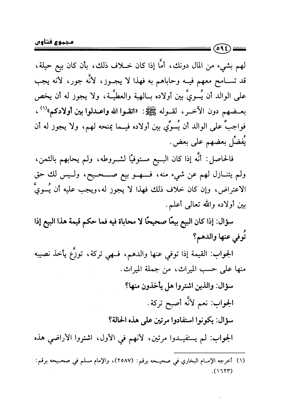 لهم بشيء من المال دونك، أما إذا كان خلاف ذلك، بأن كان بيع حيلة، قد تسامح معهم فيه وحاباهم به فهذا لا يجوز، لأنه جور، لأنه يجب على الوالد أن يسوي بين أولاده بالهبة والعطية، ولا يجوز له أن يخص بعضهم دون الآخر، لقوله صلى الله عليه وسلم: «اتقوا الله واعدلوا بين أولادكم» ، فواجب على الوالد أن يسوي بين أولاده فيما يمنحه لهم، ولا يجوز له أن يفضل بعضهم على بعض.