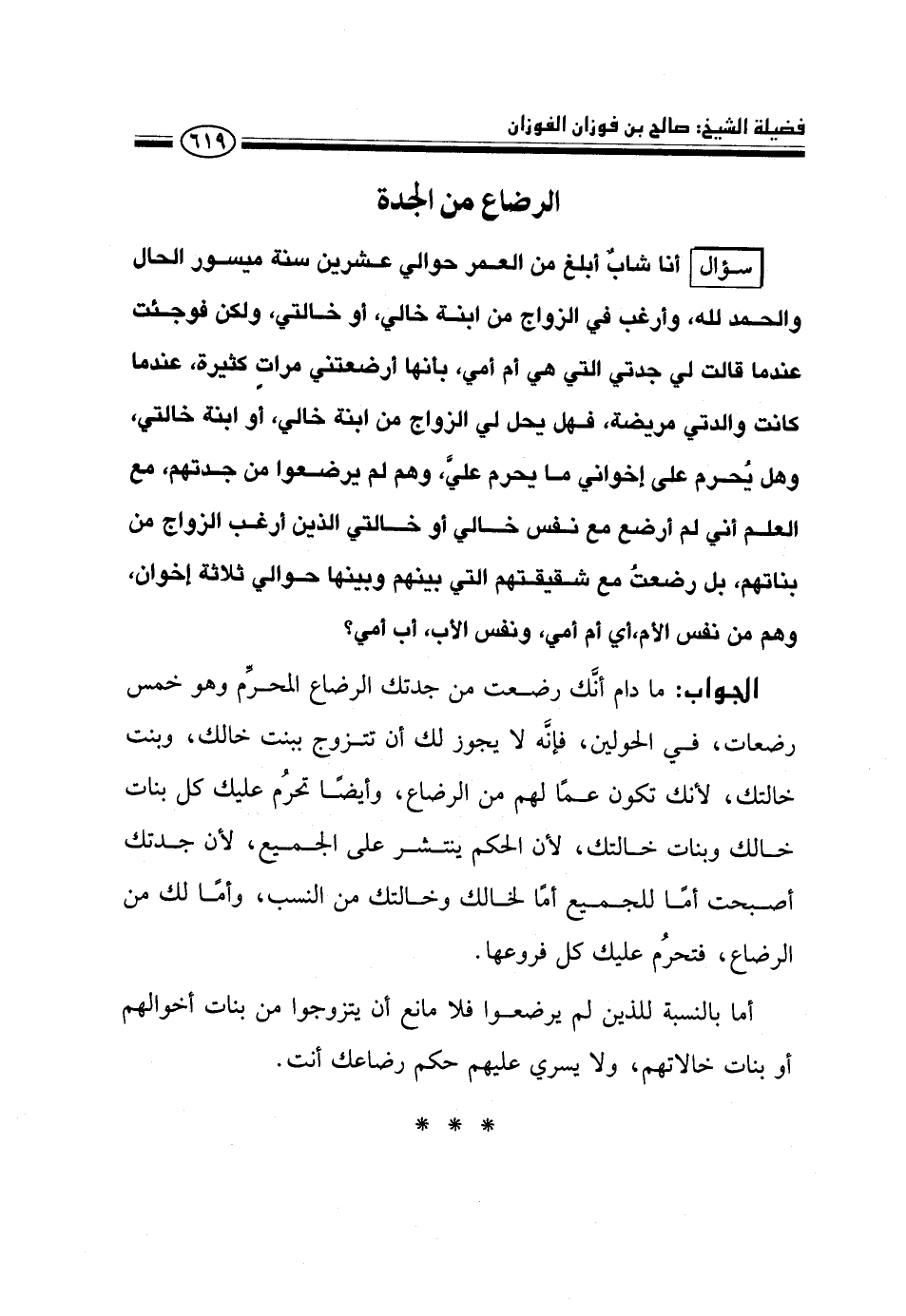 سؤال: أنا شاب أبلغ من العمر حوالي عشرين سنة ميسور الحال والحمد لله، وأرغب في الزواج من ابنة خالي، أو خالتي، ولكن فوجئت عندما قالت لي جدتي التي هي أم أمي، بأنها أرضعتني مرات كثيرة، عندما كانت والدتي مريضة، فهل يحل لي الزواج من ابنة خالي، أو ابنة خالتي، وهل يحرم على إخواني ما يحرم على علي، وهم لم يرضعوا من جدتهم، مع العلم أني لم أرضع مع نفس خالي أو خالتي الذين أرغب الزواج من بناتهم، بل رضعت مع شقيقتهم التي بينهم وبينها حوالي ثلاثة إخوان، وهم من نفس الأم، أي أم أمي، ونفس الأب، أب أمي؟