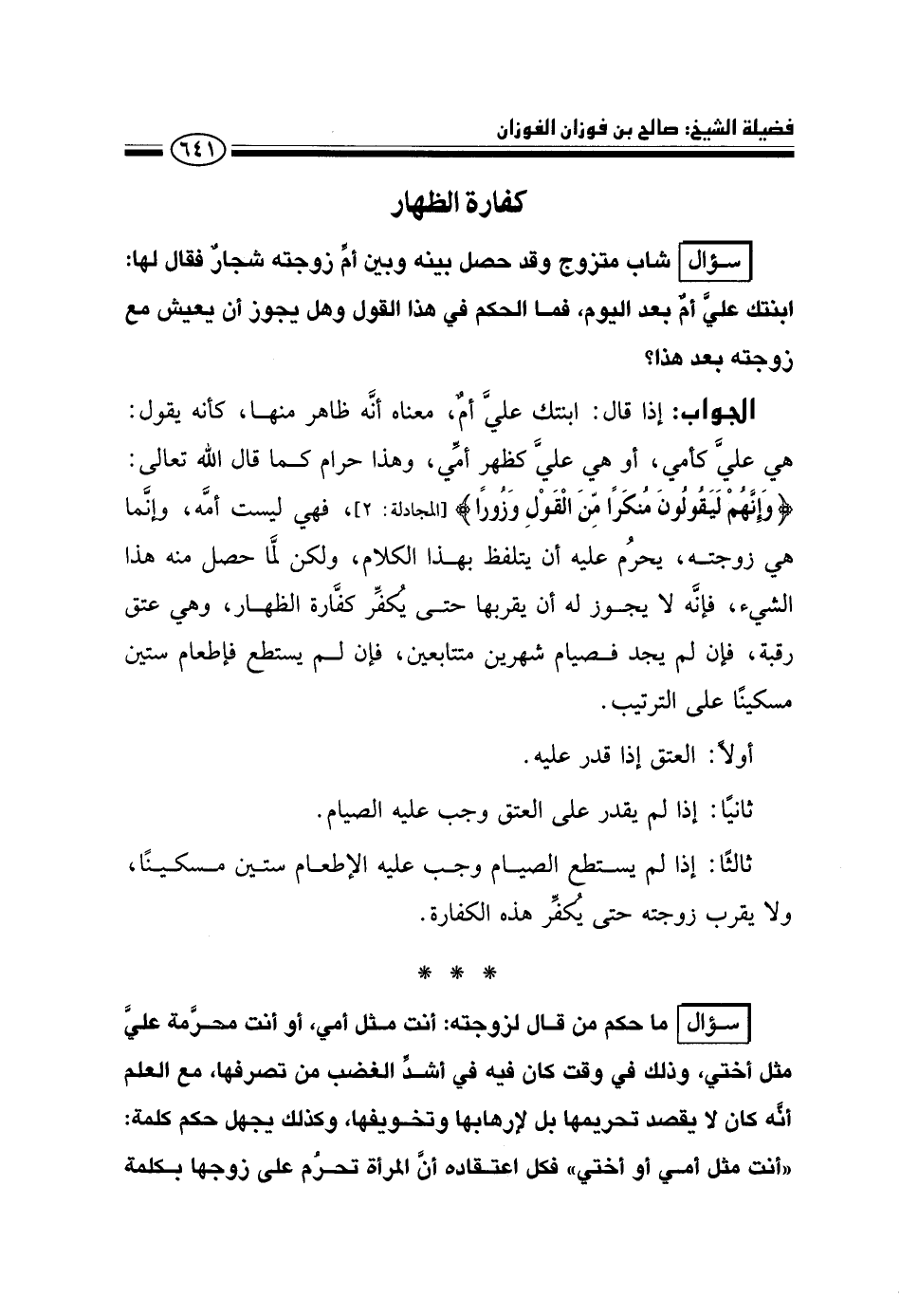 الجواب: إذا قال: ابنتك علي أم، معناه أنه ظاهر منها، كأنه يقول: هي علي كأمي، أو هي علي كظهر أمي، وهذا حرام كما قال الله تعالى: {وَإِنَّهُمْ لَيَقُولُونَ مُنْكَرًا مِنَ الْقَوْلِ وَزُورًا} [المجادلة: 2] ، فهي ليست أمه، وإنما هي زوجته، يحرم عليه أن يتلفظ بهذا الكلام، ولكن لما حصل منه هذا الشيء، فإنه لا يجوز له أن يقربها حتى يكفر كفارة الظهار، وهي عتق رقبة، فإن لم يجد فصيام شهرين متتابعين، فإن لم يستطع فإطعام ستين مسكينًا على الترتيب.