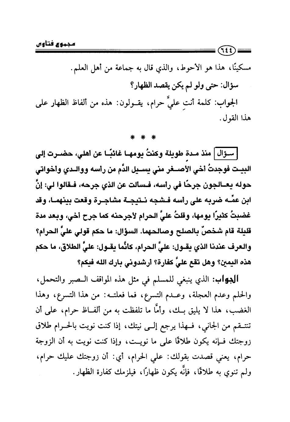 الجواب: الذي ينبغي للمسلم في مثل هذه المواقف الصبر والتحمل، والحلم وعدم العجلة، وعدم التسرع، فما فعلته: من هذا التسرع، وهذا الغضب، هذا لا يليق بك، وأما ما تلفظت به من ألفاظ حرام، على أن تنتقم من الجاني، فهذا يرجع إلى نيتك، إذا كنت نويت بالحرام طلاق زوجتك فإنه يكون طلاقًا على ما نويت، وإذا كنت نويت به أن الزوجة حرام، يعني قصدت بقولك: علي الحرام، أي: أن زوجتك عليك حرام، ولم تنوي به طلاقًا، فإنه يكون ظهارًا، فيلزمك كفارة الظهار.