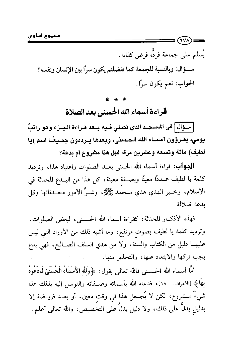 سؤال: في المسجد الذي نصلي فيه بعد قراءة الجزء وهو راتب يومي، يقرؤون أسماء الله الحسنى، وبعدها يرددون جميعًا اسم (يا لطيف) مائة وتسعة وعشرين مرة، فهل هذا مشروع أم بدعة؟