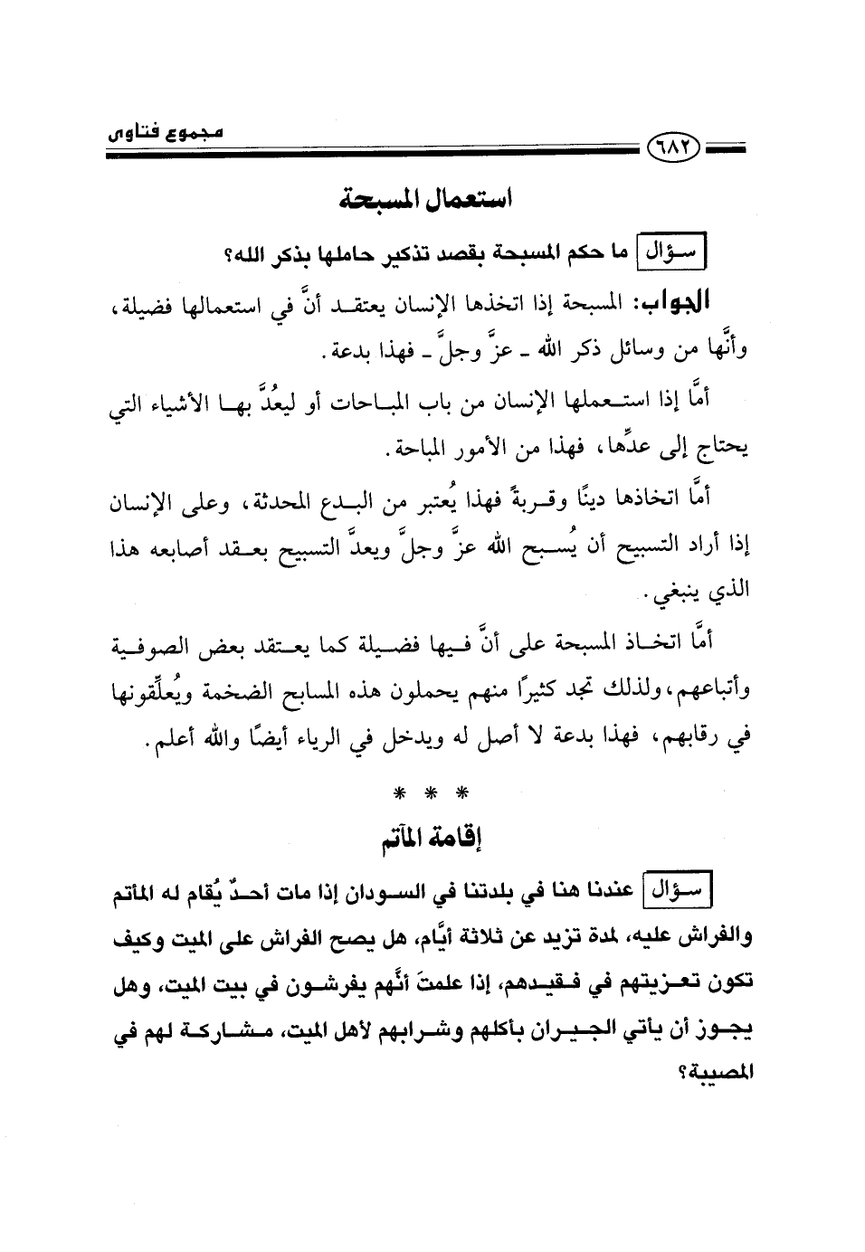 الجواب: المسبحة إذا اتخذها الإنسان يعتقد أن في استعمالها فضيلة، وأنها من وسائل ذكر الله -عز وجل- فهذا بدعة.