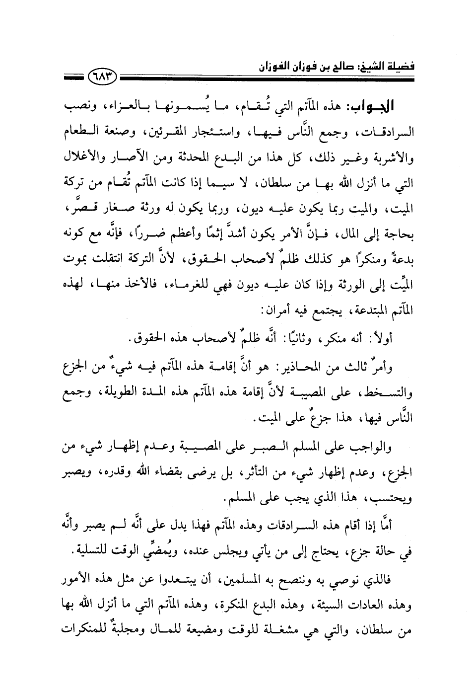 الجواب: هذه المآتم التي تقام، ما يسمونها بالعزاء، ونصب السرادقات، وجمع الناس فيها، واستئجار المقرئين، وصنعة الطعام والأشربة وغير ذلك، كل هذا من البدع المحدثة ومن الآصار والأغلال التي ما أنزل الله بها من سلطان، لا سيما إذا كانت المآتم تقام من تركة الميت، والميت ربما يكون عليه ديون، وربما يكون له ورثة صغار قصر بحاجة إلى المال، فإن الأمر يكون أشد إثمًا وأعظم ضررًا، فإنه مع كونه بدعة ومنكرًا هو كذلك ظلم لأصحاب الحقوق، لأن التركة انتقلت بموت الميت على الورثة وإذا كان عليه ديون فهي للغرماء، فالأخذ منها، لهذه المآتم المبتدعة، يجتمع فيه أمران: