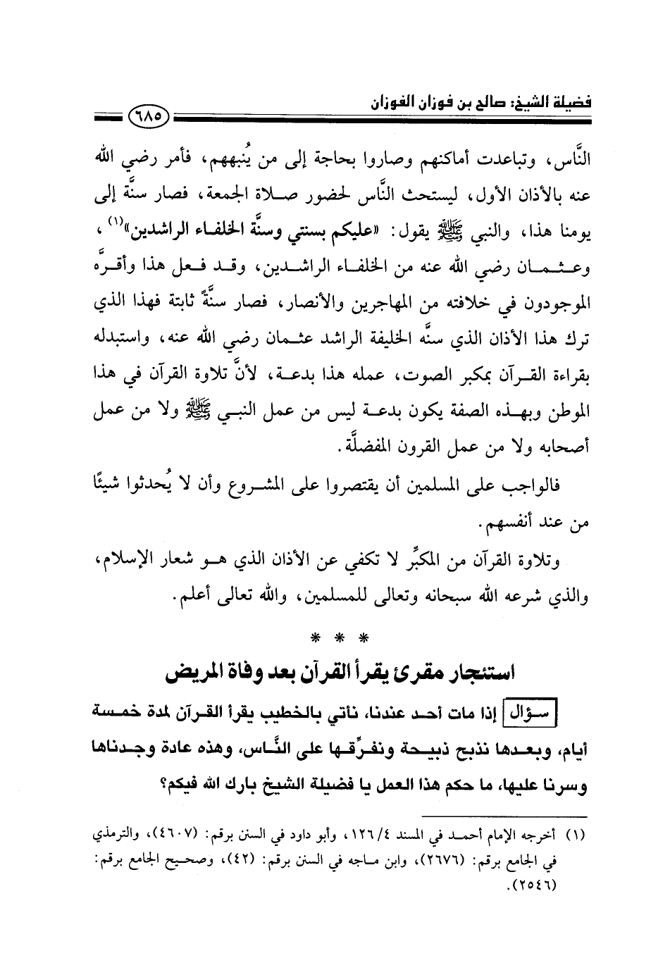 الناس، وتباعدت أماكنهم وصاروا بحاجة إلى من ينبههم، فأمر رضي الله عنه بالأذان الأول، ليستحث الناس لحضور صلاة الجمعة، فصار سنة إلى يومنا هذا، والنبي صلى الله عليه وسلم يقول: «عليكم بسنتي وسنة الخلفاء الراشدين» ، وعثمان رضي الله عنه من الخلفاء الراشدين، وقد فعل هذا وأقره الموجودون في خلافته من المهاجرين والأنصار، فصار سنة ثابتة فهذا الذي ترك هذا الأذان الذي سنه الخليفة الراشد عثمان رضي الله عنه، واستبدله بقراءة القرآن بمكبر الصوت، عمله هذا بدعة، لأن تلاوة القرآن في هذا الموطن وبهذه الصفة يكون بدعة ليس من عمل النبي صلى الله عليه وسلم ولا من عمل أصحابه ولا من عمل القرون المفضلة.
