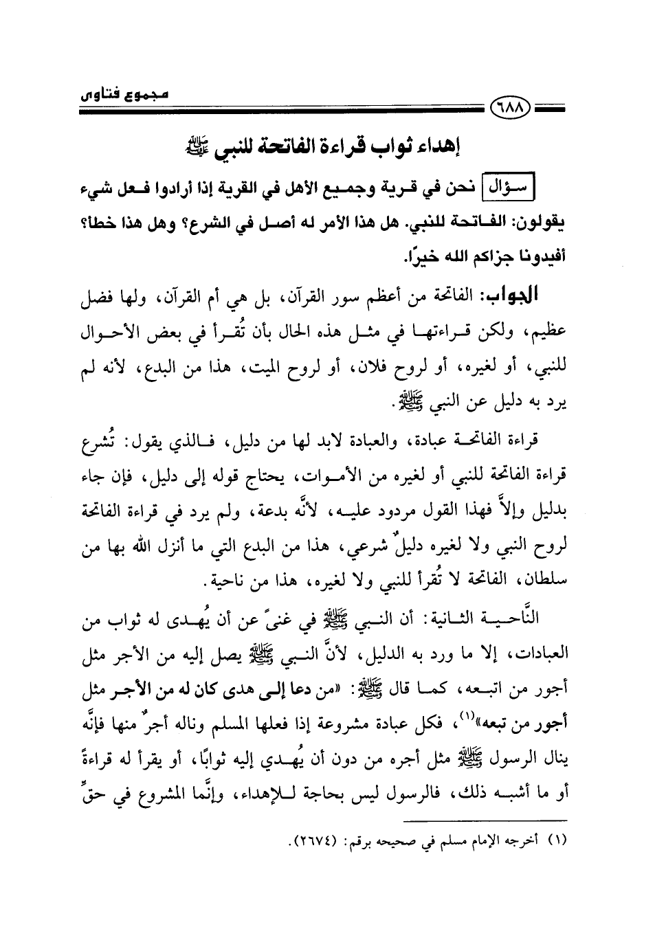 الناحية الثانية: أن النبي صلى الله عليه وسلم في غنى عن أن يهدى له ثواب من العبادات، إلا ما ورد به الدليل، لأن النبي صلى الله عليه وسلم يصل إليه من الأجر مثل أجور من اتبعه، كما قال صلى الله عليه وسلم: «من دعا إلى هدى كان له من الأجر مثل أجور من تبعه» ، فكل عبادة مشروعة إذا فعلها المسلم وناله أجر منها فإنه ينال الرسول صلى الله عليه وسلم مثل أجره من دون أن يهدي إليه ثوابًا، أو يقرأ له قراءة أو ما أشبه ذلك، فالرسول ليس بحاجة للإهداء، وإنما المشروع في حق