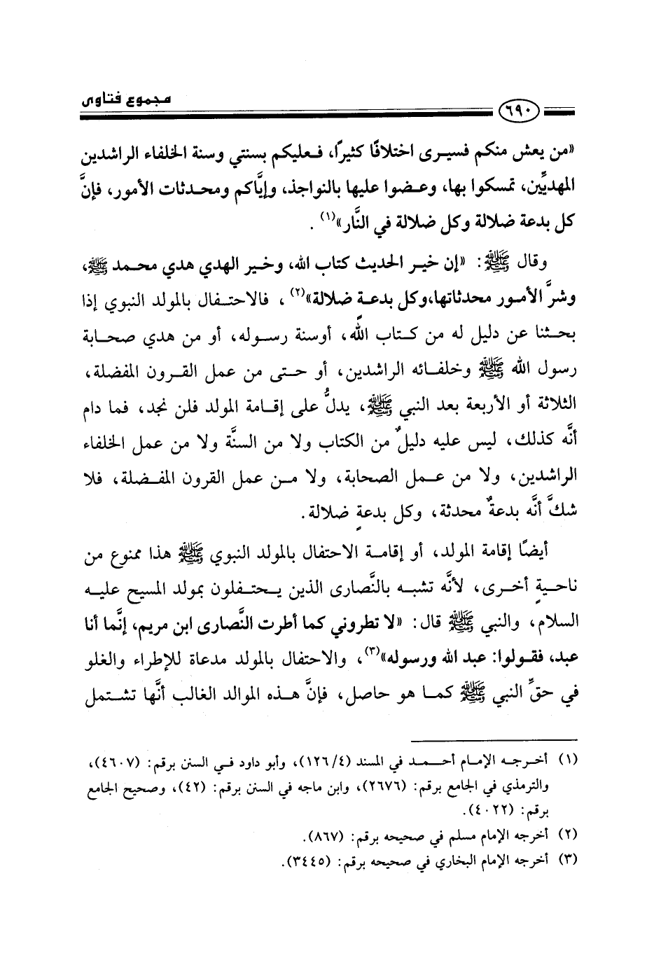 وقال صلى الله عليه وسلم: «إن خير الحديث كتاب الله، وخير الهدي هدي محمد صلى الله عليه وسلم، وشر الأمور محدثاتها، وكل بدعة ضلالة» ، فالاحتفال بالمولد النبوي إذا بحثنا عن دليل له من كتاب الله، أو سنة رسوله، أو من هدي صحابة رسول الله صلى الله عليه وسلم وخلفائه الراشدين، أو حتى من عمل القرون المفضلة، الثلاثة أو الأربعة بعد النبي صلى الله عليه وسلم، يدل على إقامة المولد فلن نجد، فما دام أنه كذلك، ليس عليه دليل من الكتاب ولا من السنة ولا من عمل الخلفاء الراشدين، ولا من عمل الصحابة، ولا من عمل القرون المفضلة، فلا شك أنه بدعة محدثة، وكل بدعة ضلالة.