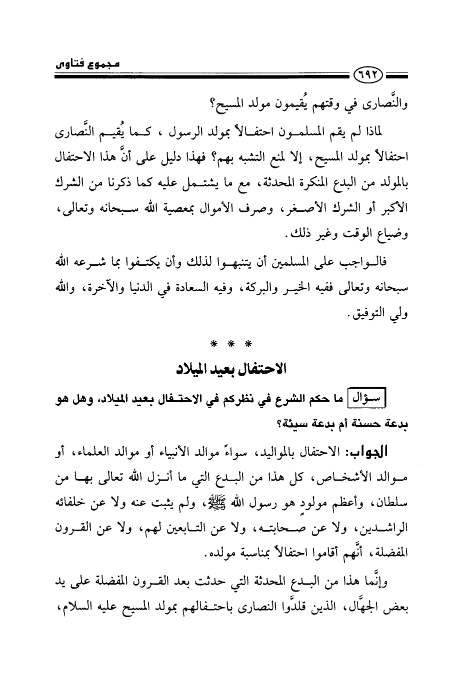 لماذا لم يقم المسلمون احتفالًا بمولد الرسول، كما يقيم النصارى احتفالًا بمولد المسيح، إلا لمنع التشبه بهم؟ فهذا دليل على أن هذا الاحتفال بالمولد من البدع المنكرة المحدثة، مع ما يشتمل عليه كما ذكرنا من الشرك الأكبر أو الشرك الأصغر، وصرف الأموال بمعصية الله سبحانه وتعالى، وضياع الوقت وغير ذلك.