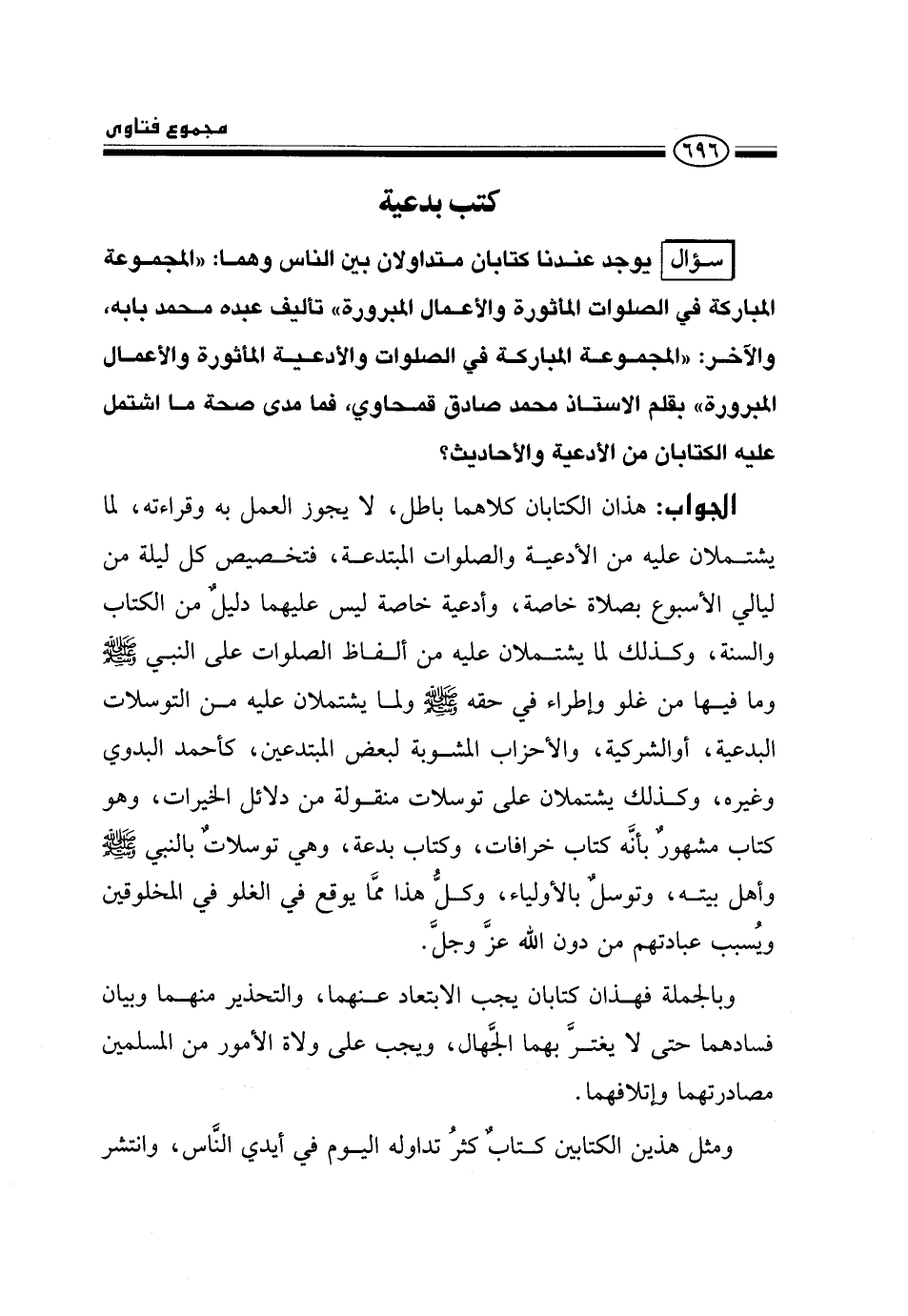 الجواب: هذان الكتابان كلاهما باطل، لا يجوز العمل به وقراءته، لما يشتملان عليه من الأدعية والصلوات المبتدعة، فتخصيص كل ليلة من ليالي الأسبوع بصلاة خاصة، وأدعية خاصة ليس عليهما دليل من الكتاب والسنة، وكذلك لما يشتملان عليه من ألفاظ الصلوات على النبي صلى الله عليه وسلم وما فيها من غلو وإطراء في حقه صلى الله عليه وسلم ولما يشتملان عليه من التوسلات البدعية، أو الشركية، والأحزاب المشوبة لبعض المبتدعين، كأحمد البدوي وغيره، وكذلك يشتملان على توسلات منقولة من دلائل الخيرات، وهو كتاب مشهور بأنه كتاب خرافات، وكتاب بدعة، وهي توسلات بالنبي صلى الله عليه وسلم وأهل بيته، وتوسل بالأولياء، وكل هذا مما يوقع في الغلو في المخلوقين ويسبب عبادتهم من دون الله عز وجل.