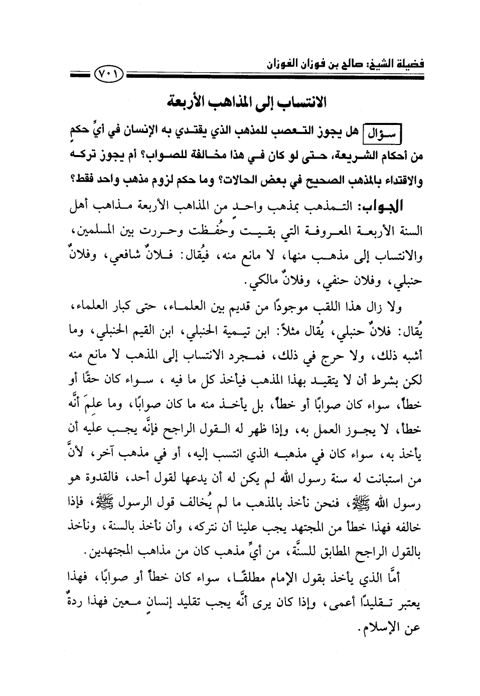 ولا زال هذا اللقب موجودًا من قديم بين العلماء، حتى كبار العلماء، يقال: فلان حنبلي، يقال مثلًا: ابن تيمية الحنبلي، ابن القيم الحنبلي، وما أشبه ذلك، ولا حرج في ذلك، فمجرد الانتساب إلى المذهب لا مانع منه لكن بشرط أن لا يتقيد بهذا المذهب فيأخذ كل ما فيه، سواء كان حقًّا أو خطأً، سواء كان صوابًا أو خطأً، بل يأخذ منه ما كان صوابًا، وما علم أنه خطأ، لا يجوز العمل به، وإذا ظهر له القول الراجح فإنه يجب عليه أن يأخذ به، سواء كان في مذهبه الذي انتسب إليه، أو في مذهب آخر، لأن من استبانت له سنة رسول الله لم يكن له أن يدعها لقول أحد، فالقدوة هو رسول الله صلى الله عليه وسلم، فنحن نأخذ بالمذهب ما لم يخالف قول الرسول صلى الله عليه وسلم، فإذا خالفه فهذا خطأ من المجتهد يجب علينا أن نتركه، وأن نأخذ بالسنة، ونأخذ بالقول الراجح المطابق للسنة، من أي مذهب كان من مذاهب المجتهدين.