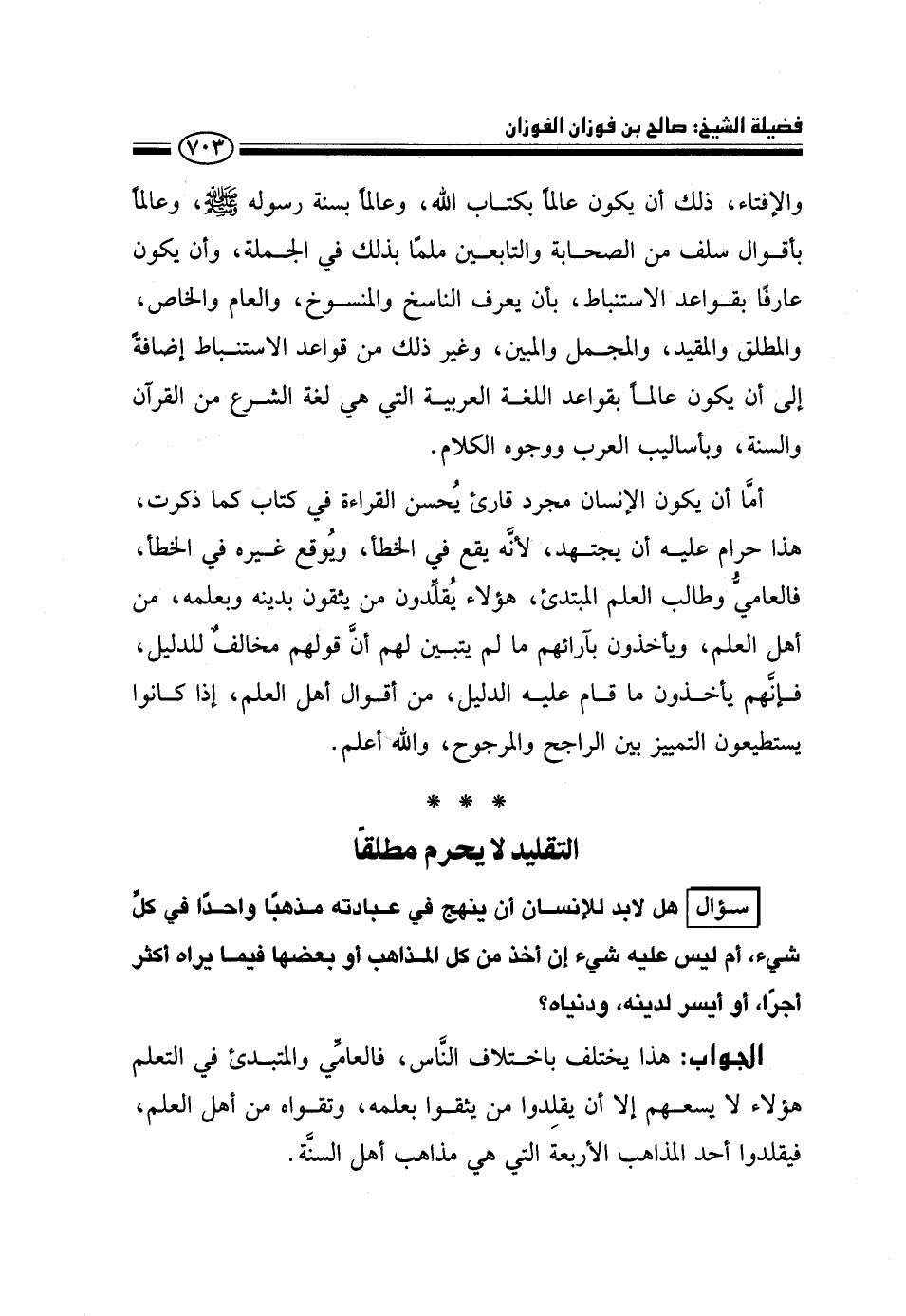 الجواب: هذا يختلف باختلاف الناس، فالعامي والمبتدئ في التعلم هؤلاء لا يسعهم إلا أن يقلدوا من يثقوا بعلمه، وتقواه من أهل العلم، فيقلدوا أحد المذاهب الأربعة التي هي مذاهب أهل السنة.