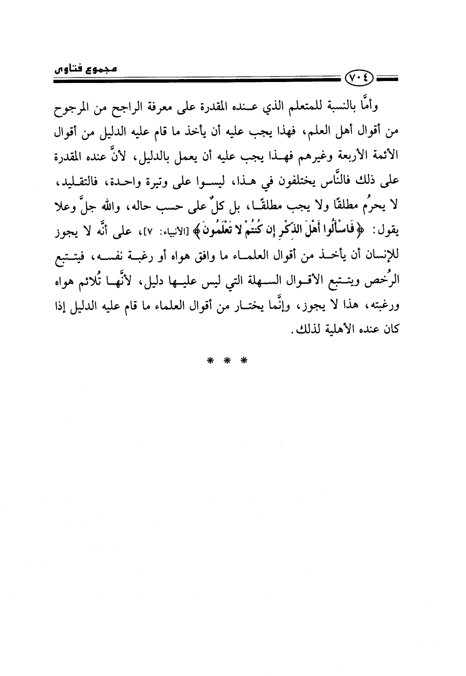وأما بالنسبة للمتعلم الذي عنده المقدرة على معرفة الراجح من المرجوح من أقوال أهل العلم، فهذا يجب عليه أن يأخذ ما قام عليه الدليل من أقوال الأئمة الأربعة وغيرهم فهذا يجب عليه أن يعمل بالدليل، لأن عنده المقدرة على ذلك فالناس يختلفون في هذا، ليسوا على وتيرة واحدة، فالتقليد لا يحرم مطلقًا ولا يجب مطلقًا، بل كل على حسب حاله، والله جل وعلا يقول: {فَاسْأَلُوا أَهْلَ الذِّكْرِ إِنْ كُنْتُمْ لَا تَعْلَمُونَ} [الأنبياء: 7] ، على أنه لا يجوز للإنسان أن يأخذ من أقوال العلماء ما وافق هواه أو رغبة نفسه، فيتتبع الرخص ويتتبع الأقوال السهلة التي ليس عليها دليل، لأنها تلائم هواه ورغبته، هذا لا يجوز، وإنما يختار من أقوال العلماء ما قام عليه الدليل إذا كان عنده الأهلية لذلك.