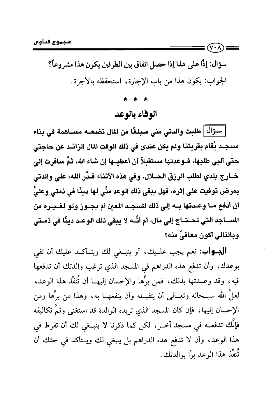 الجواب: نعم يجب عليك، أو ينبغي لك ويتأكد عليك أن تفي بوعدك، وأن تدفع هذه الدراهم في المسجد الذي ترغب والدتك أن تدفعها فيه، وقد وعدتها بذلك، فمن برها والإحسان إليها أن تنفذ هذا الوعد، لعل الله سبحانه وتعالى أن يتقبله وأن ينفعها به، وهذا من برها ومن الإحسان إليها، فإن كان المسجد الذي تريده الوالدة قد استغنى وتم تكاليفه فإنك تدفعه في مسجد آخر، لكن كما ذكرنا لا ينبغي لك أن تفرط في هذا الوعد، وأن لا تدفع هذه الدراهم بل ينبغي لك ويتأكد في حقك أن تنفذ هذا الوعد برًا بوالدتك.