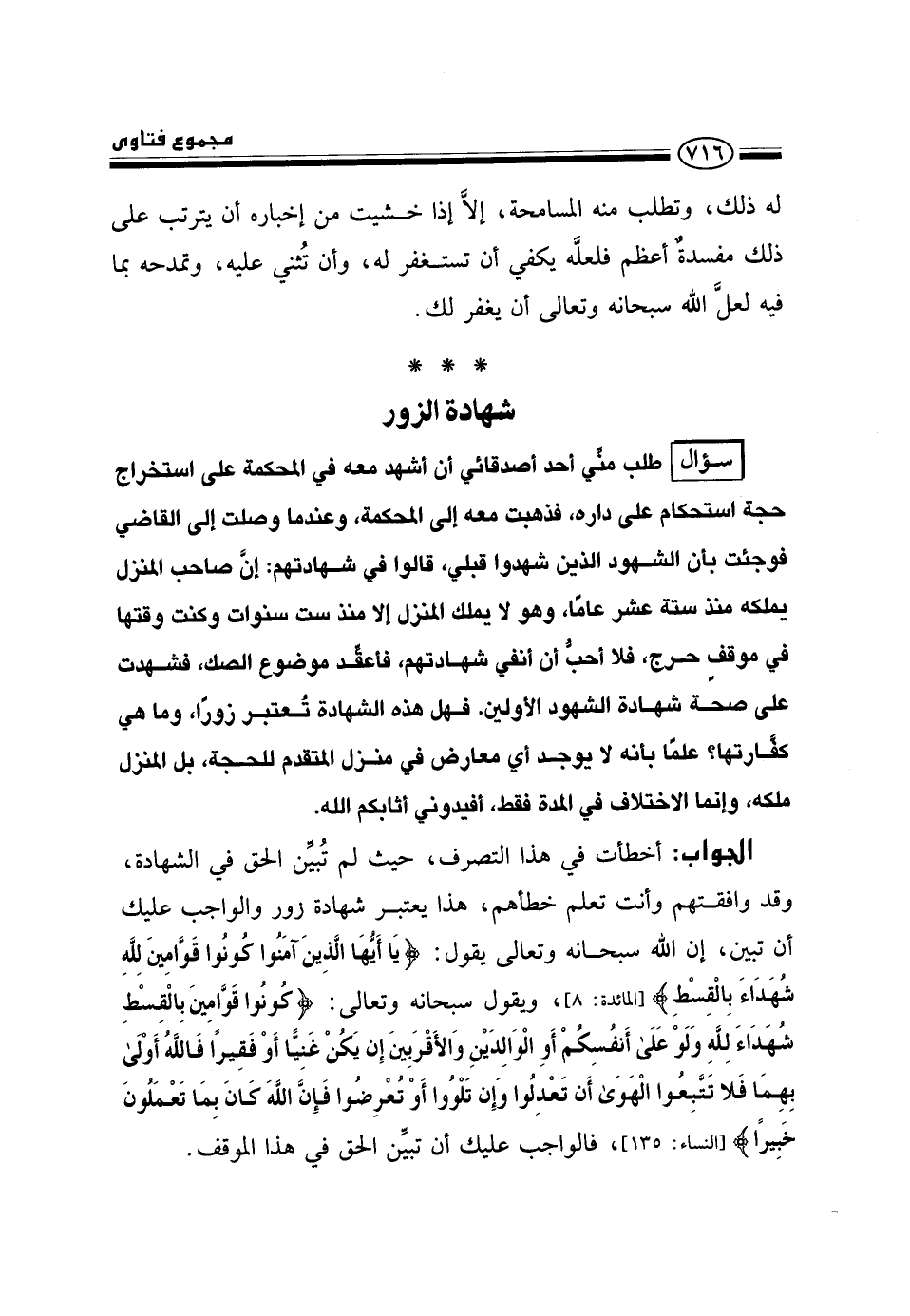 سؤال: طلب مني أحد أصدقائي أن أشهد معه في المحكمة على استخراج حجة استحكام على داره، فذهبت معه إلى المحكمة، وعندما وصلت إلى القاضي فوجئت بأن الشهود الذين شهدوا قبلي، قالوا في شهادتهم: إن صاحب المنزل يملكه منذ ستة عشر عامًا، وهو يملك المنزل إلا منذ ست سنوات وكنت وقتها في موقف حرج، فلا أحب أن أنفي شهادتهم، فأعقد موضوع الصك، فشهدت على صحة شهادة الشهود الأولين. فهل هذه الشهادة تعتبر زورًا، وما هي كفارتها؟ علمًا بأنه لا يوجد أي معارض في منزل المتقدم للحجة، بل المنزل ملكه، وإنما الاختلاف في المدة فقط، أفيدوني أثابكم الله.