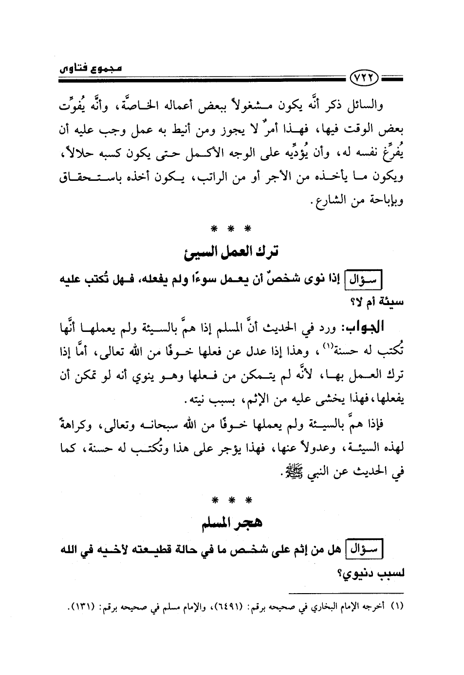 سؤال: إذا نوى شخص أن يعمل سوءًا ولم يفعله، فهل تكتب عليه سيئة أم لا؟