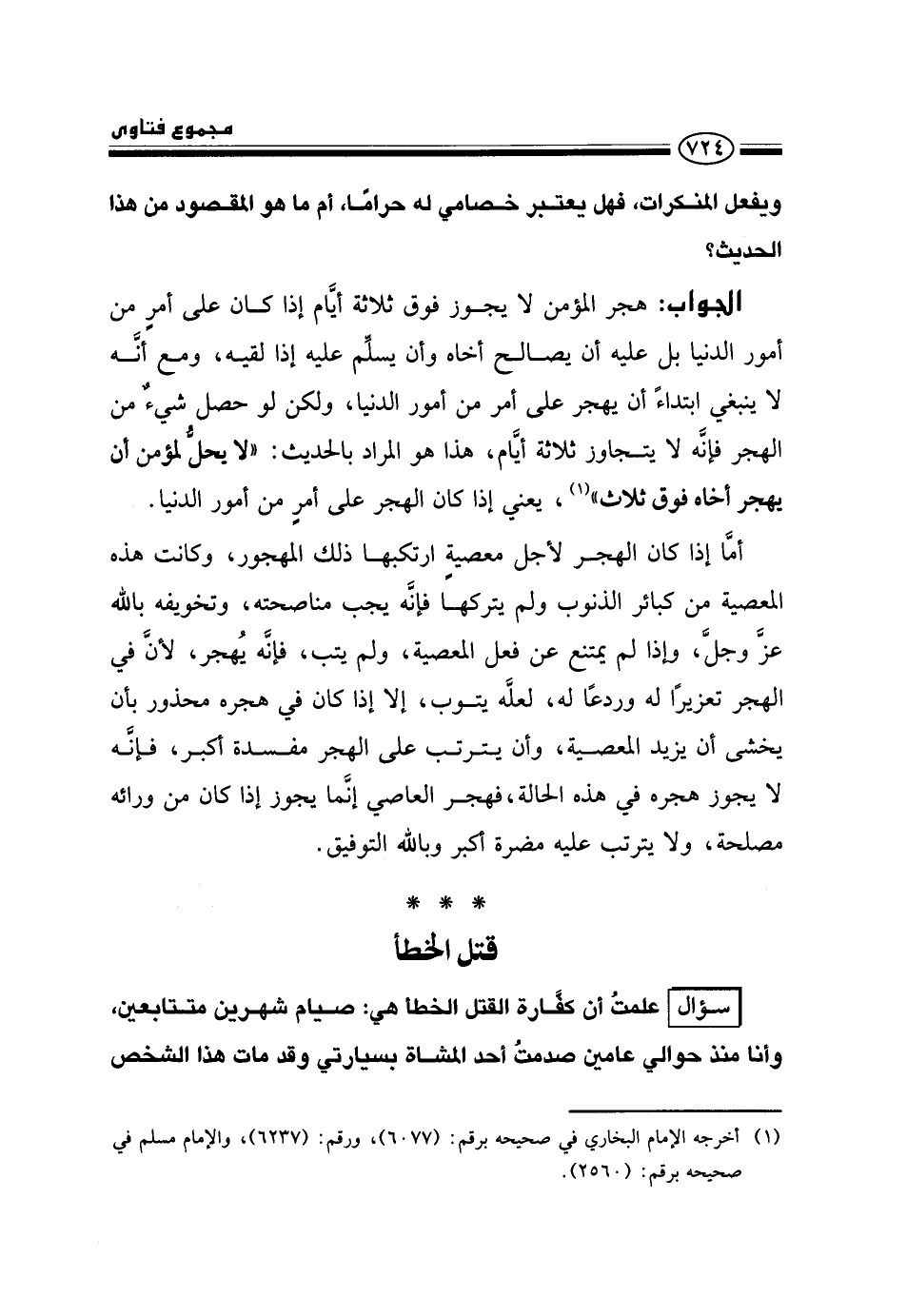 الجواب: هجر المؤمن لا يجوز فوق ثلاثة أيام إذا كان على أمر من أمور الدنيا بل عليه أن يصالح أخاه وأن يسلم عليه إذا لقيه، ومع أنه لا ينبغي ابتداءً أن يهجر على أمر من أمور الدنيا، ولكن لو حصل شيء من الهجر فإنه لا يتجاوز ثلاثة أيام، هذا هو المراد بالحديث: «لا يحل لمسلم أن يهجر أخاه فوق ثلاث» ، يعني إذا كان الهجر على أمر من أمور الدنيا.