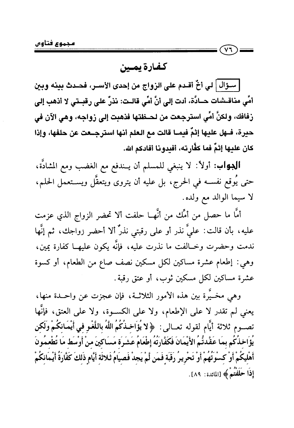 سؤال: لي أخ أقدم على الزواج من إحدى الأسر، فحدث بينه وبين أمي مناقشات حادة، أدت إلى أن أمي قالت: نذر على رقبتي لا أذهب إلى زفافك، ولكن أمي استرجعت من لحظتها فذهبت إلى زواجه، وهي الآن في حيرة، فهل عليها إثم فيما قالت، مع العلم أنها استرجعت عن حلفها، وإذا كان عليها إثم فما كفارته، أفيدونا أفادكم الله.
