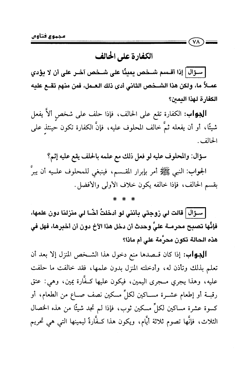 الجواب: إذا كان قصدها منع دخول هذا الشخص المنزل إلا بعد أن تعلم بذلك وتأذن له، وأدخلته المنزل بدون علمها، فقد خالفت ما حلفت عليه، وهذا يجري مجرى اليمين، فيكون عليها كفارة يمين، وهي: عتق رقبة أو إطعام عشرة مساكين، لكل مسكين نصف صاع من الطعام، أو كسوة عشرة مساكين لكل مسكين ثوب، فإذا لم تجد شيئًا من هذه الخصال الثلاث، فإنها تصوم ثلاثة أيام، ويكون هذا كفارة ليمينها التي هي تحريم