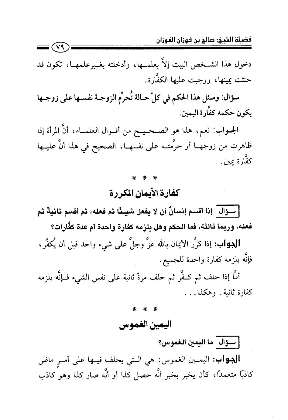 سؤال: ومثل هذا الحكم في كل حالة تحرم الزوجة نفسها على زوجها، يكون حكمه كفارة اليمين.